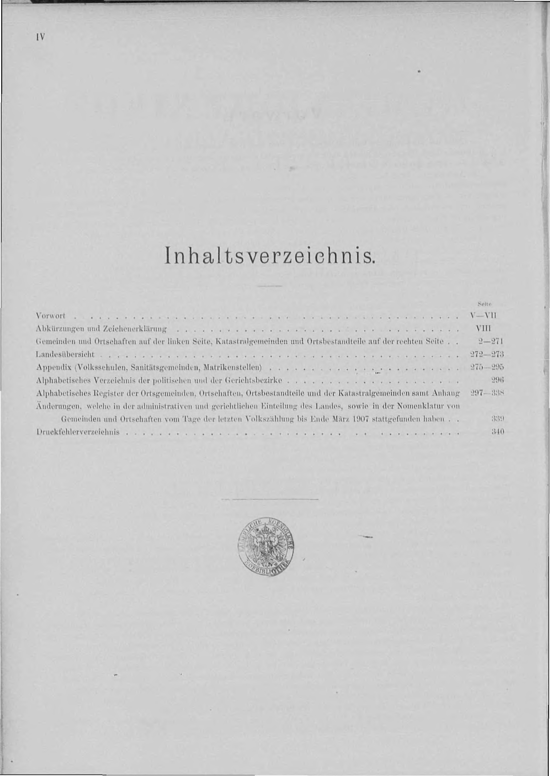 | Änderungen, welche in der administrativen und gerichtlichen Einteilung des Landes, sowie in der Nomenklatur von Gemeinden und Ortschaften vom Tage der letzten Volkszählung bis Ende März 1907 stattgefunden haben | 339 |