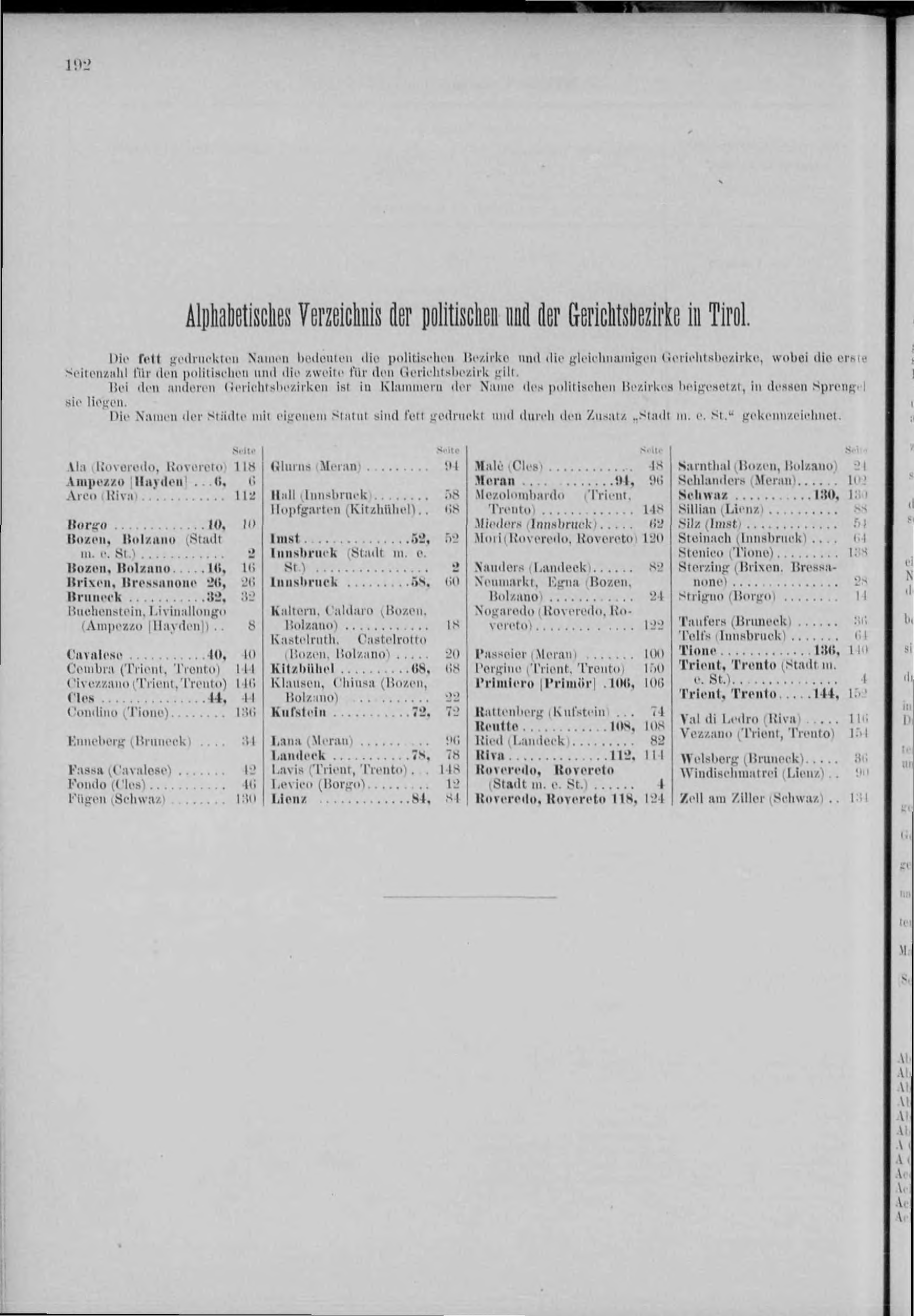 Fassa (Cavalese) 42 Lienz 84, 84 Roveredo, Rovereto (Stadt m. e. St.) 4 Welsberg (Bruneck) 36