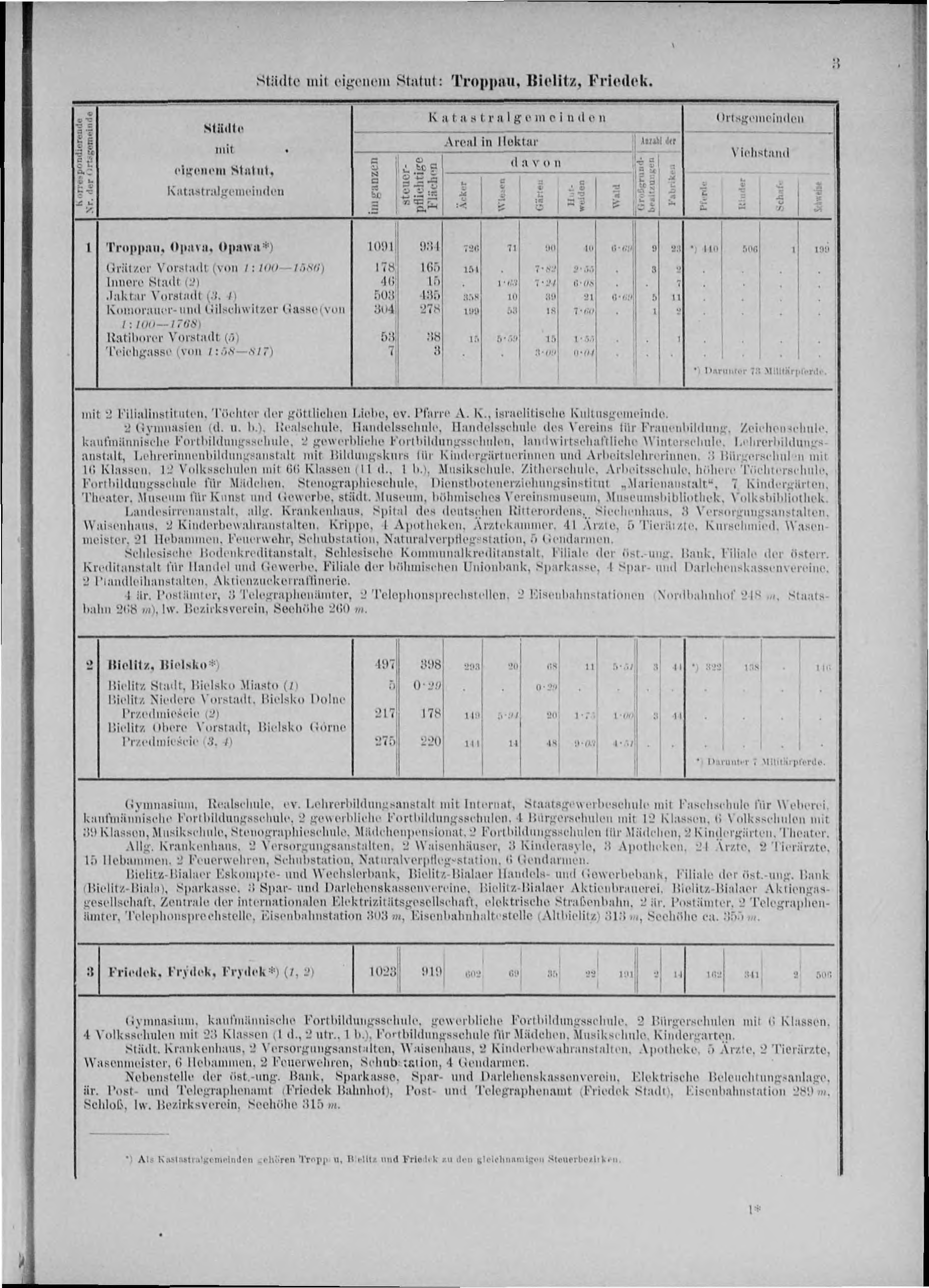 Städt. Krankenhaus, 2 Versorgungsanstalten, Waisenhaus, 2 Kinderbewahranstalten, Apotheke, 5 Ärzte, 2 Tierärzte, Wasenmeister, 6 Hebammen, 2 Feuerwehren, Schubstation, 4 Gendarmen. Nebenstelle der öst.-ung. Bank, Sparkasse, Spar- und Darlehenskassenverein, Elektrische Beleuchtungsanlage, är. Post- und Telegraphenamt (Friedek Bahnhof), Post- und Telegraphenamt (Friedek Stadt), Eisenbahnstation 289 m, Schloß, lw. Bezirksverein, Seehöhe 315 m. *) Als Katastralgemeinden gehören Troppau, Bielitz und Friedeck zu den gleichnamigen Steuerbezirken. | ||||||||||||||