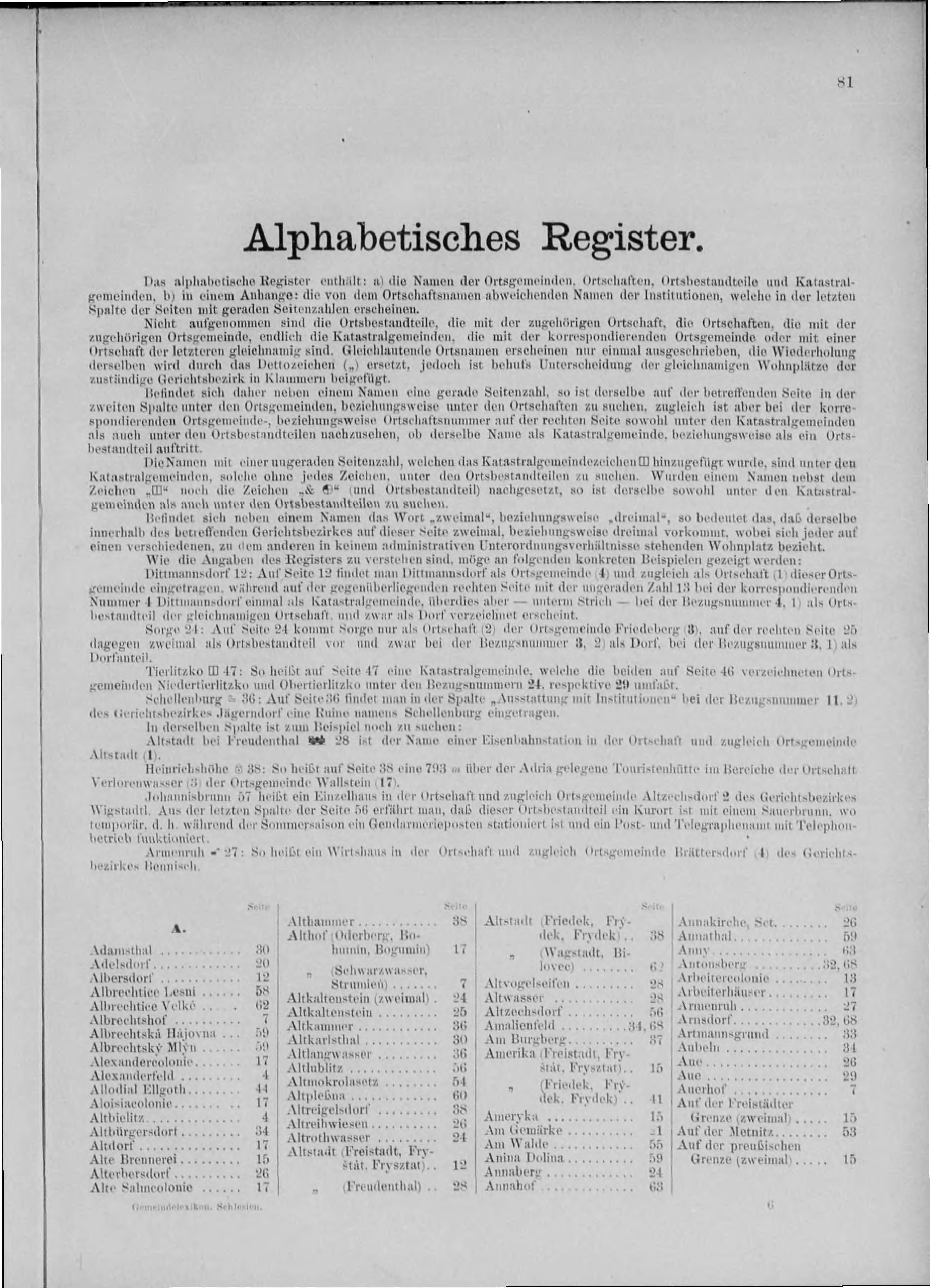 Das alphabetische Register erhält: a) die Namen der Ortsgemeinden, Ortschaften, Ortsbestandteile und Katastralgemeinden, b) in einem Anhange: die von dem Ortschaftsnamen abweichenden Namen der Institutionen, welche in der letzten Spalte der Seiten mit geraden Seitenzahlen erscheinen.