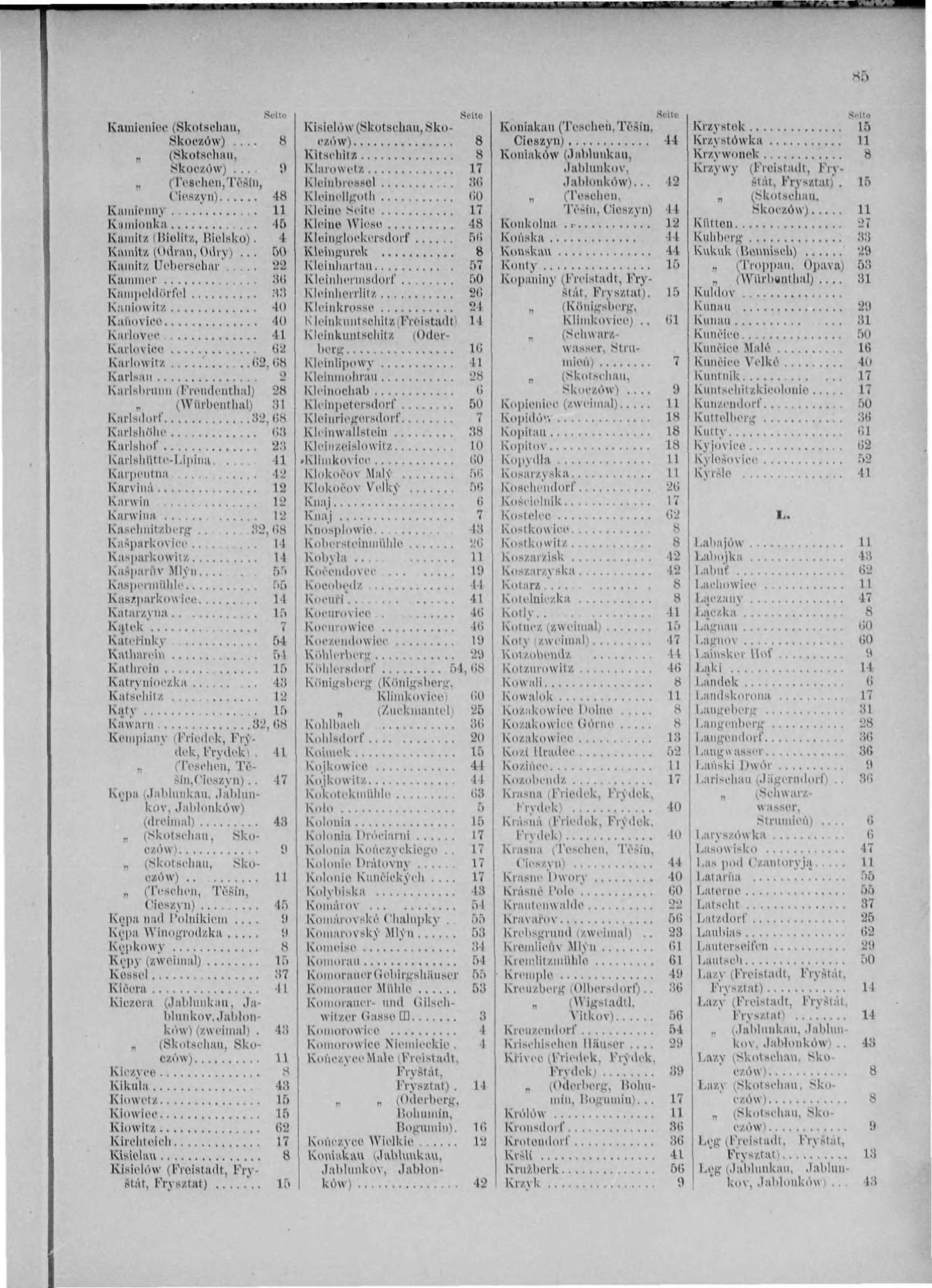 | Kamitz Ueberschar | 22 | Kleinglockersdorf | 56 | Kopaniny (Freistadt, Frýštát, Frysztat) | 15 | Kukuk (Bennisch) | 29 | |