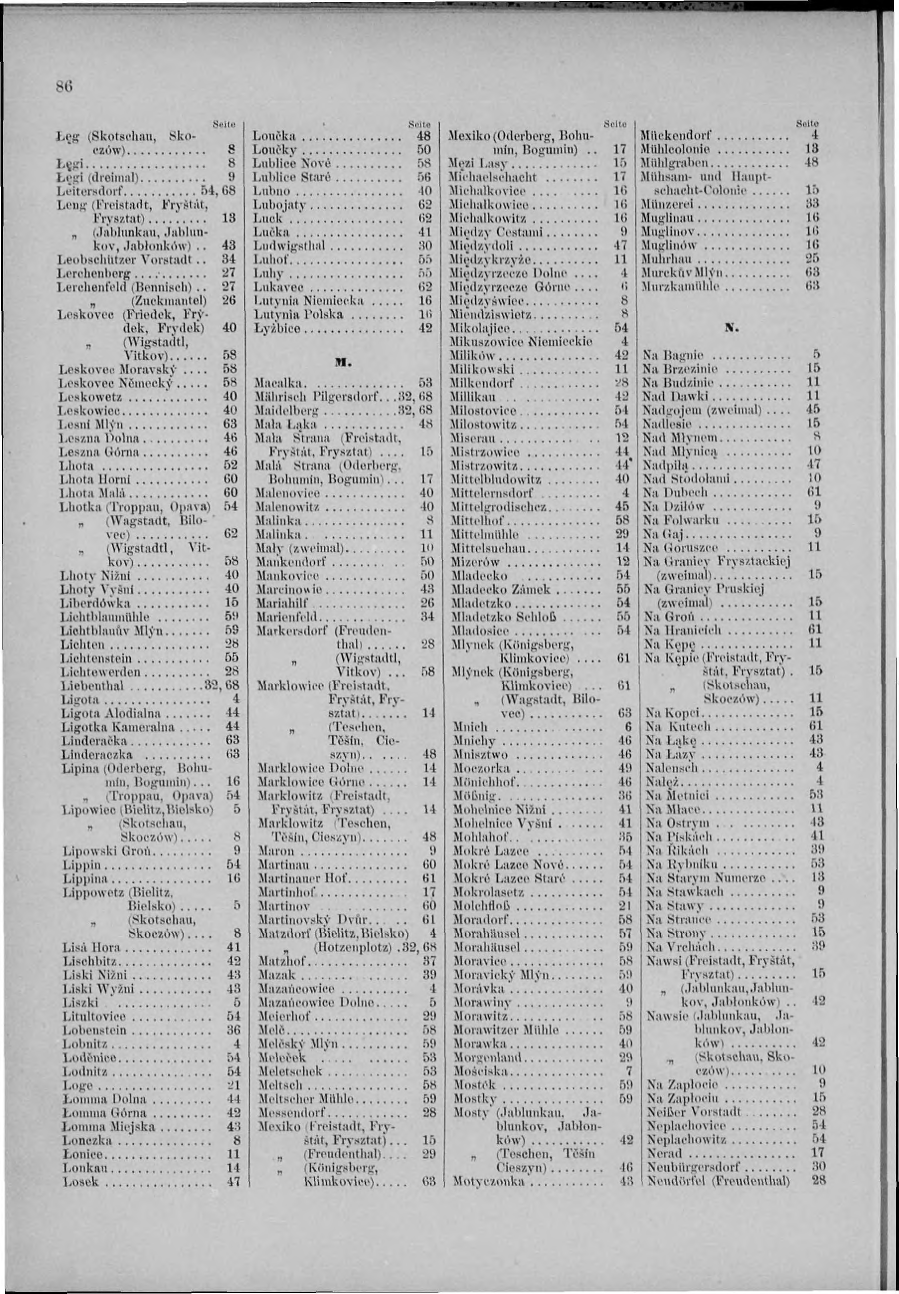 | Łomma Górna | 42 | Mexiko (Freistadt, Frýštát, Frysztat) | 15 | Morawitzer Mühle | 59 | Neplachowitz | 54 |