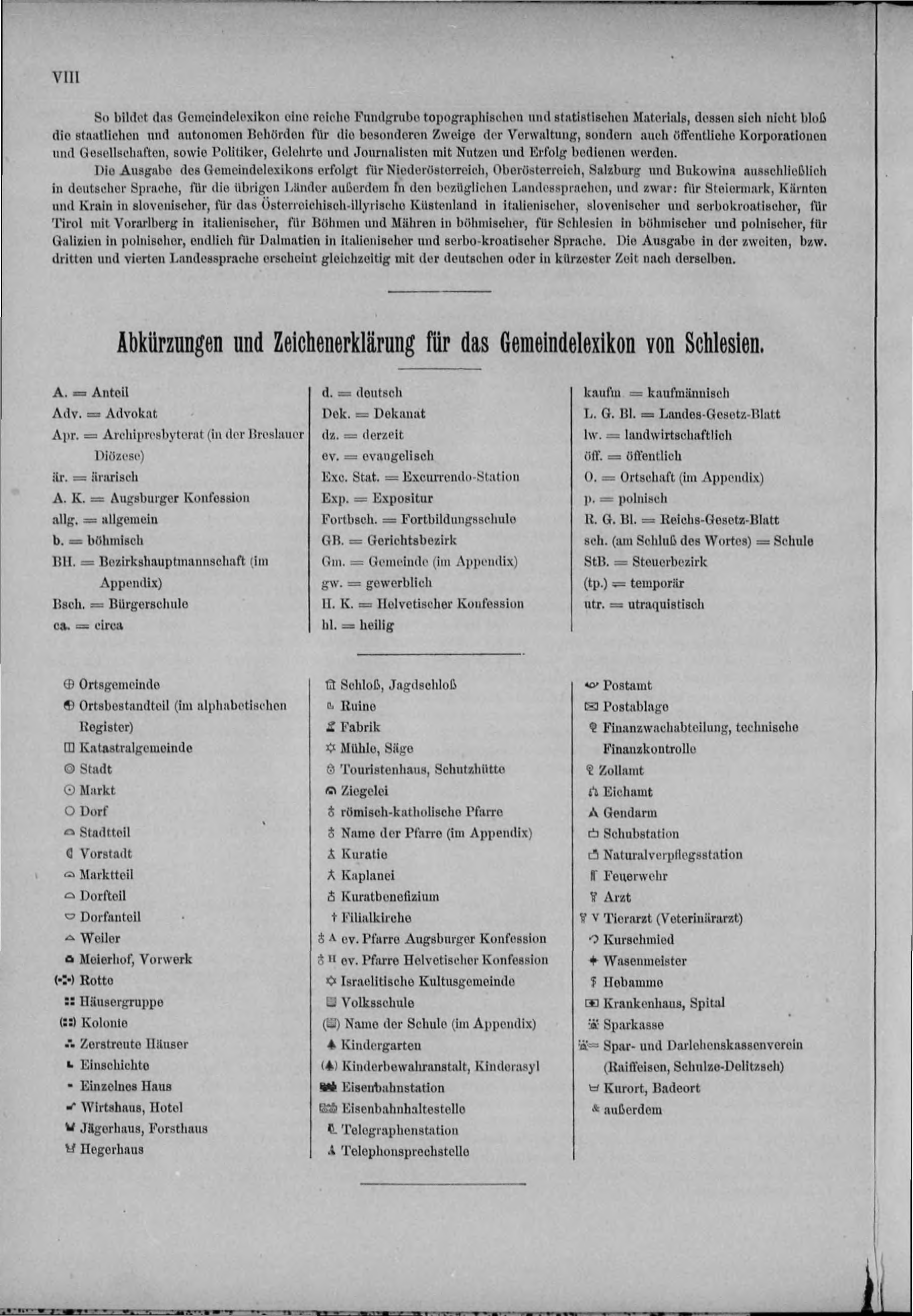 Abkürzungen und Zeichenerklärung für das Gemeindelexikon von Schlesien.
