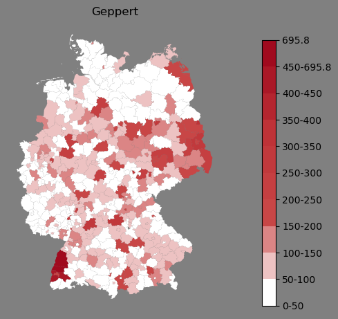 Absolute Verteilung des Namens Geppert (1890)Direkt zur Karte Absolute Verteilung des Namens "Geppert" um 1890 im damaligen Deutschen Reich Sie können die Karte innerhalb des Fensters zoomen und verschieben. |
