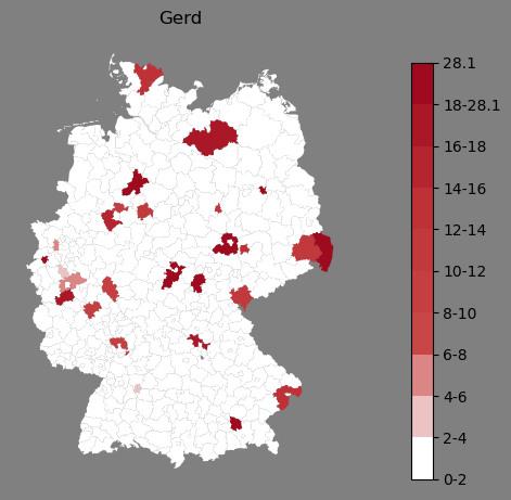 Relative Verteilung des Namens Gerd (1996)Direkt zur Karte Die Farbskala zeigt die Anzahl von "Gerd" bezogen auf je 1 Million Einträge. |