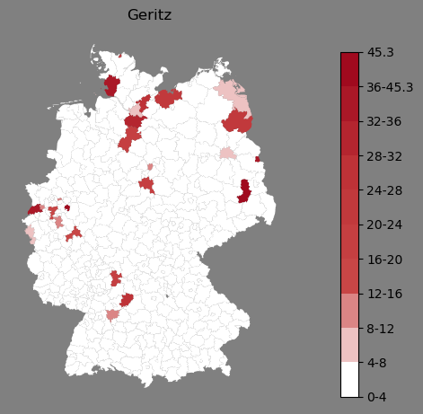 Relative Verteilung des Namens Geritz (1996)Direkt zur Karte Die Farbskala zeigt die Anzahl von "Geritz" bezogen auf je 1 Million Einträge. |