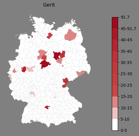 Relative Verteilung des Namens Gerlt (1996)Direkt zur Karte Die Farbskala zeigt die Anzahl von "Gerlt" bezogen auf je 1 Million Einträge. |