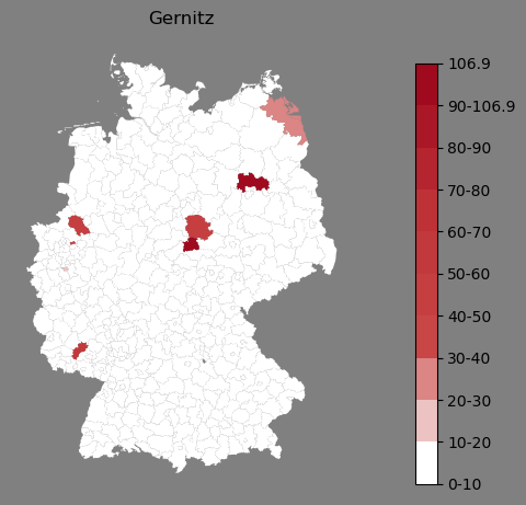 Relative Verteilung des Namens Gernitz (1996)Direkt zur Karte Die Farbskala zeigt die Anzahl von "Gernitz" bezogen auf je 1 Million Einträge. |