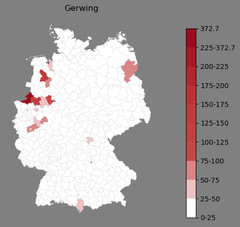 Relative Verteilung des Namens Gerwing (1996)Direkt zur Karte Die Farbskala zeigt die Anzahl von "Gerwing" bezogen auf je 1 Million Einträge. |