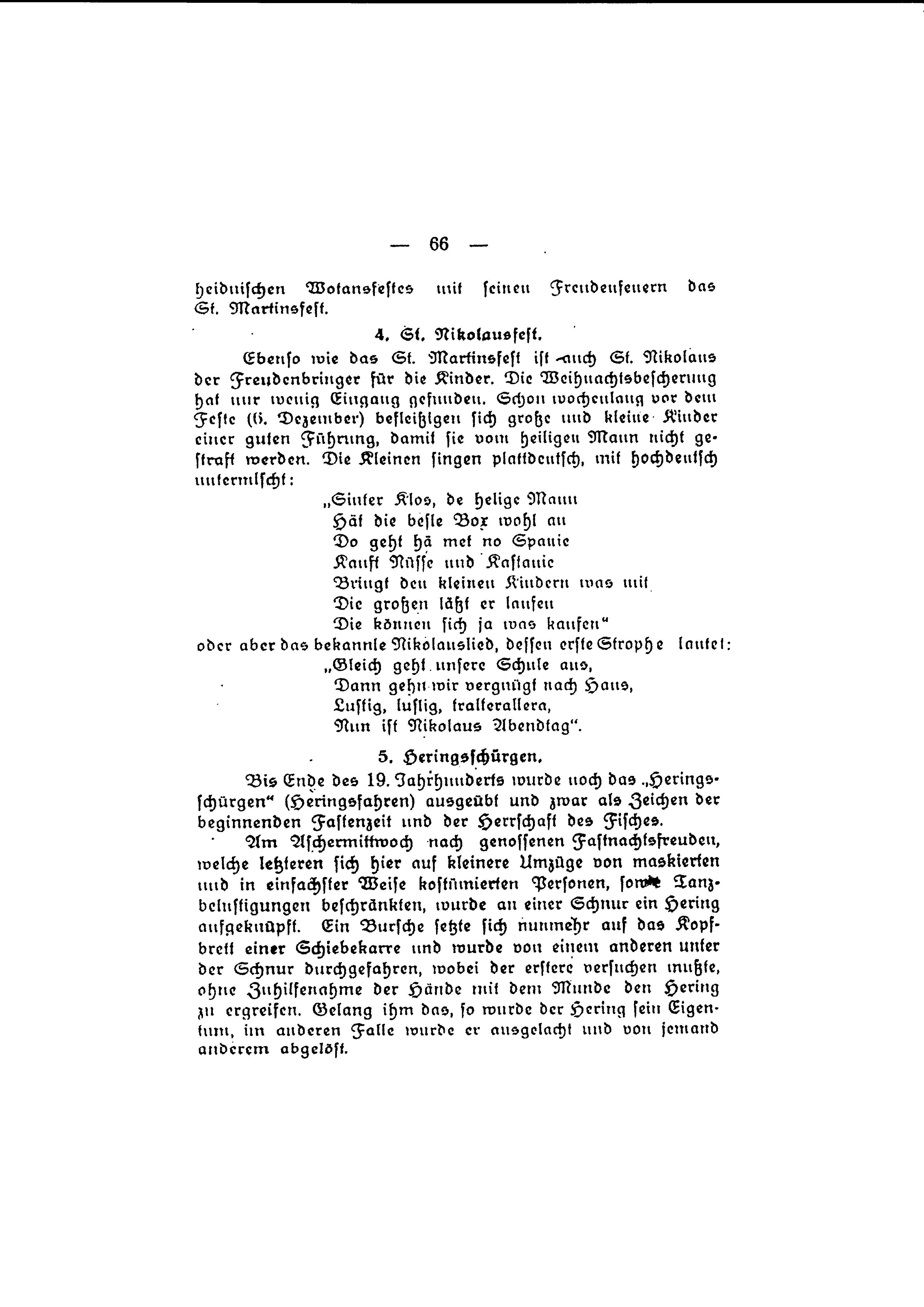 Ebenso wie das St. Martinsfest ist auch St. Nikolaus der Freudenbringer für die Kinder. Die Weihnachtsbescherung hat nur wenig Eingang gefunden. Schon wochenlang vor dem Feste (6. Dezember) befleißigen sich große und kleine Kinder einer guten Führung, damit sie vom heiligen Mann nicht gestraft werden. Die Kleinen singen plattdeutsch, mit hochdeutsch untermischt:
