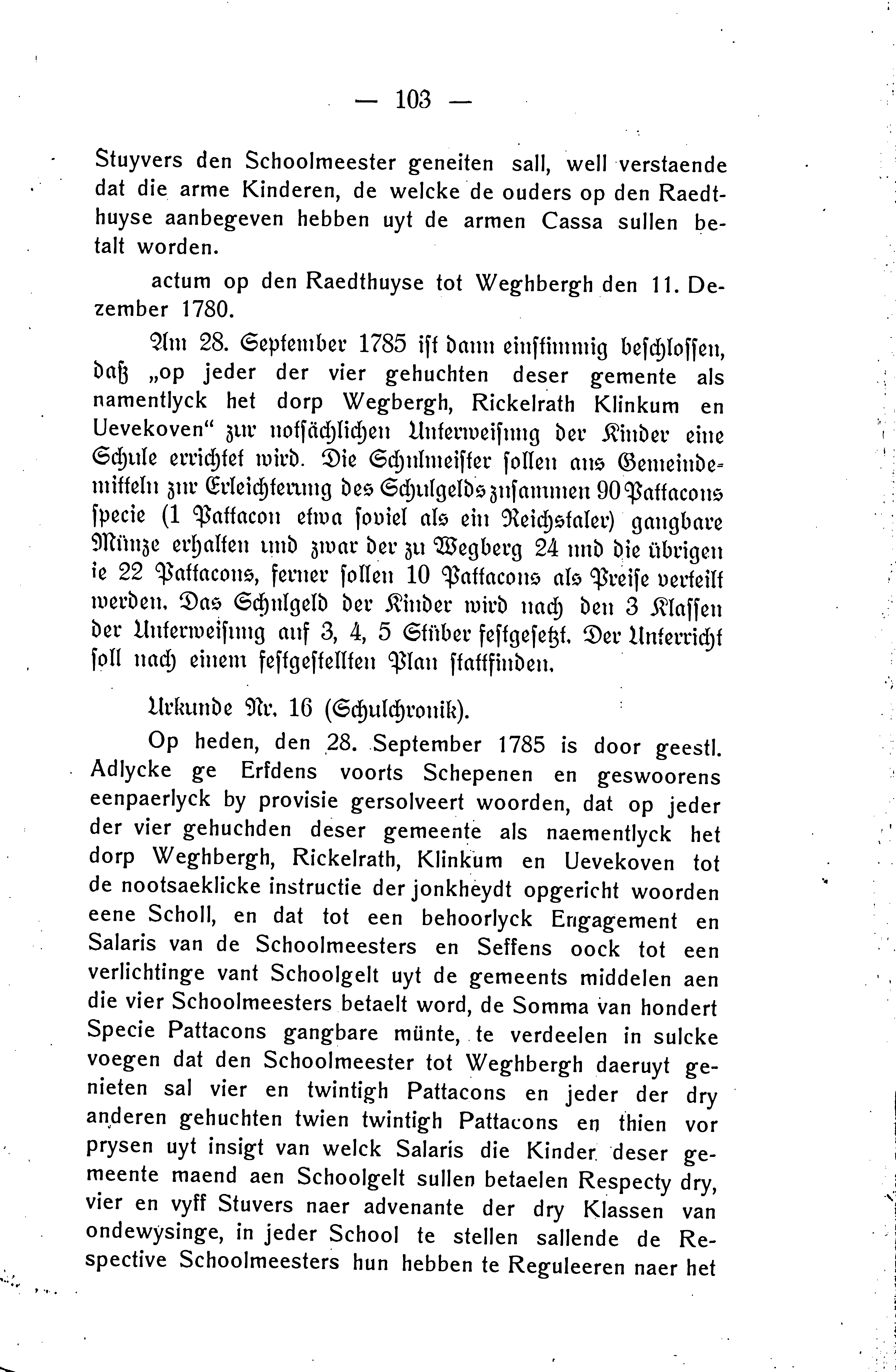 Op heden, den 28. September 1785 is door geestl. Adlycke ge Erfdens voorts Schepenen en geswoorens eenpaerlyck by provisie gersolveert woorden, dat op jeder der vier gehuchden deser gemeente als naementlyck het dorp Weghbergh, Rickelrath, Klinkum en Uevekoven tot de nootsaeklicke instructie der jonkheydt opgericht woorden eene Scholl, en dat tot een behoorlyck Engagement en Salaris van de Schoolmeesters en Seffens oock tot een verlichtinge vant Schoolgelt uyt de gemeents middelen aen die vier Schoolmeesters betaelt word, de Somma van hondert Specie Pattacons gangbare münte, te verdeelen in sulcke voegen dat den Schoolmeester tot Weghbergh daeruyt genieten sal vier en twintigh Pattacons en jeder der dry anderen gehuchten twien twintigh Pattacons en thien vor prysen uyt insigt van welck Salaris die Kinder deser gemeente maend aen Schoolgelt sullen betaelen Respecty dry, vier en vyff Stuvers naer advenante der dry Klassen van ondewysinge, in jeder School te stellen sallende de Respective Schoolmeesters hun hebben te Reguleeren naer het
