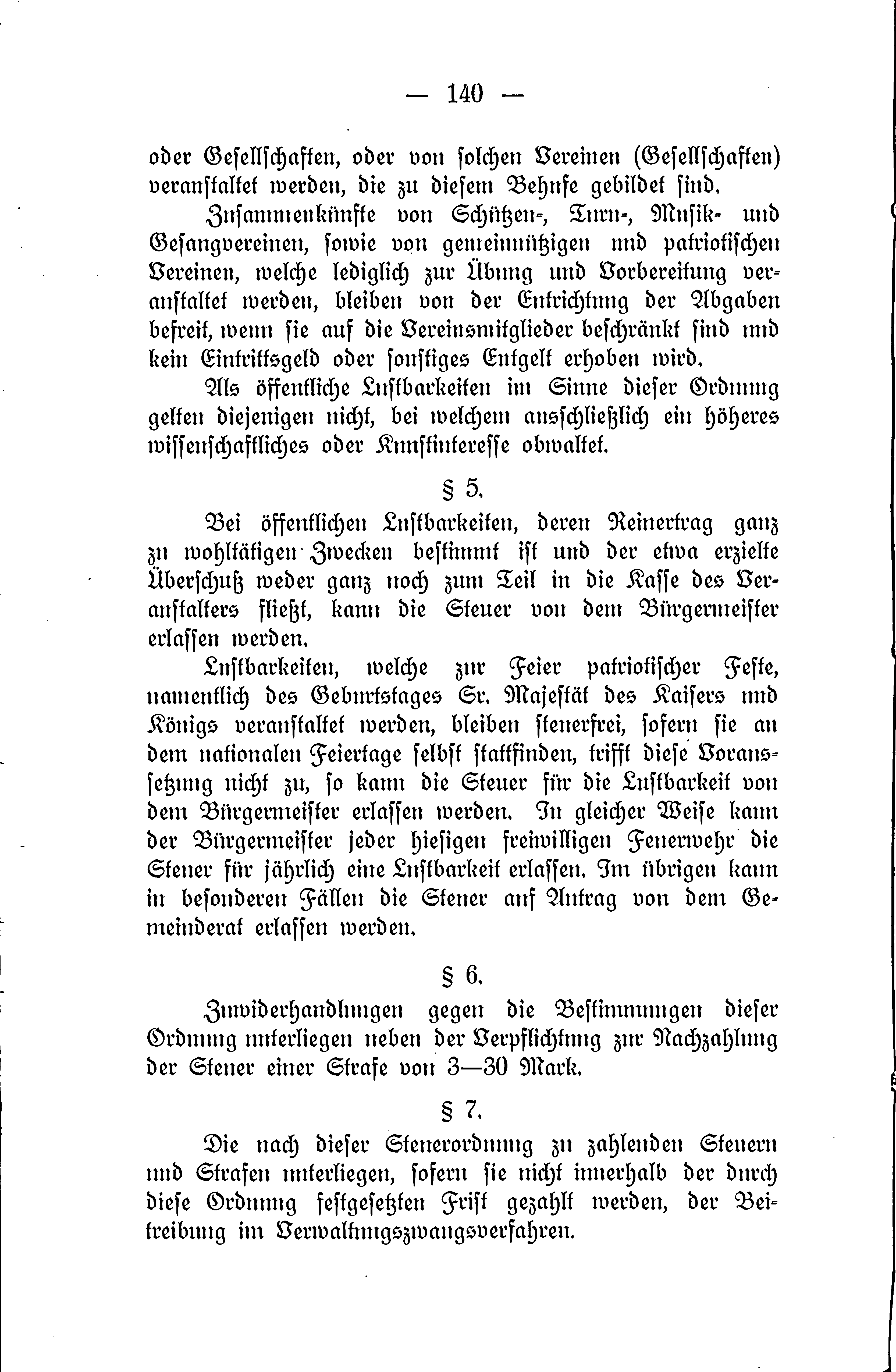 Lustbarkeiten, welche zur Feier patriotischer Feste, namentlich des Geburtstages Sr. Majestät des Kaisers und Königs veranstaltet werden, bleiben steuerfrei, sofern sie an dem nationalen Feiertage selbst stattfinden, trifft diese Voraussetzung nicht zu, so kann die Steuer für die Lustbarkeit von dem Bürgermeister erlassen werden. In gleicher Weise kann der Bürgermeister jeder hiesigen freiwilligen Feuerwehr die Steuer für jährlich eine Lustbarkeit erlassen. Im übrigen kann in besonderen Fällen die Steuer auf Antrag von dem Gemeinderat erlassen werden.