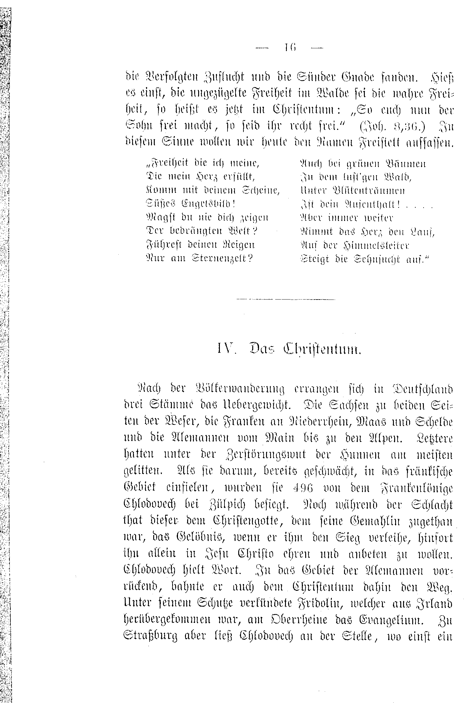 die Verfolgten Zuflucht und die Sünder Gnade fanden. Hieß es einst, die ungezügelte Freiheit im Walde sei die wahre Freiheit, so heißt es jetzt im Christentum : „So euch nun der Sohn frei macht, so seid ihr recht frei.“ (Joh. 8,36.) In diesem Sinne wollen wir heute den Namen Freistett auffassen.