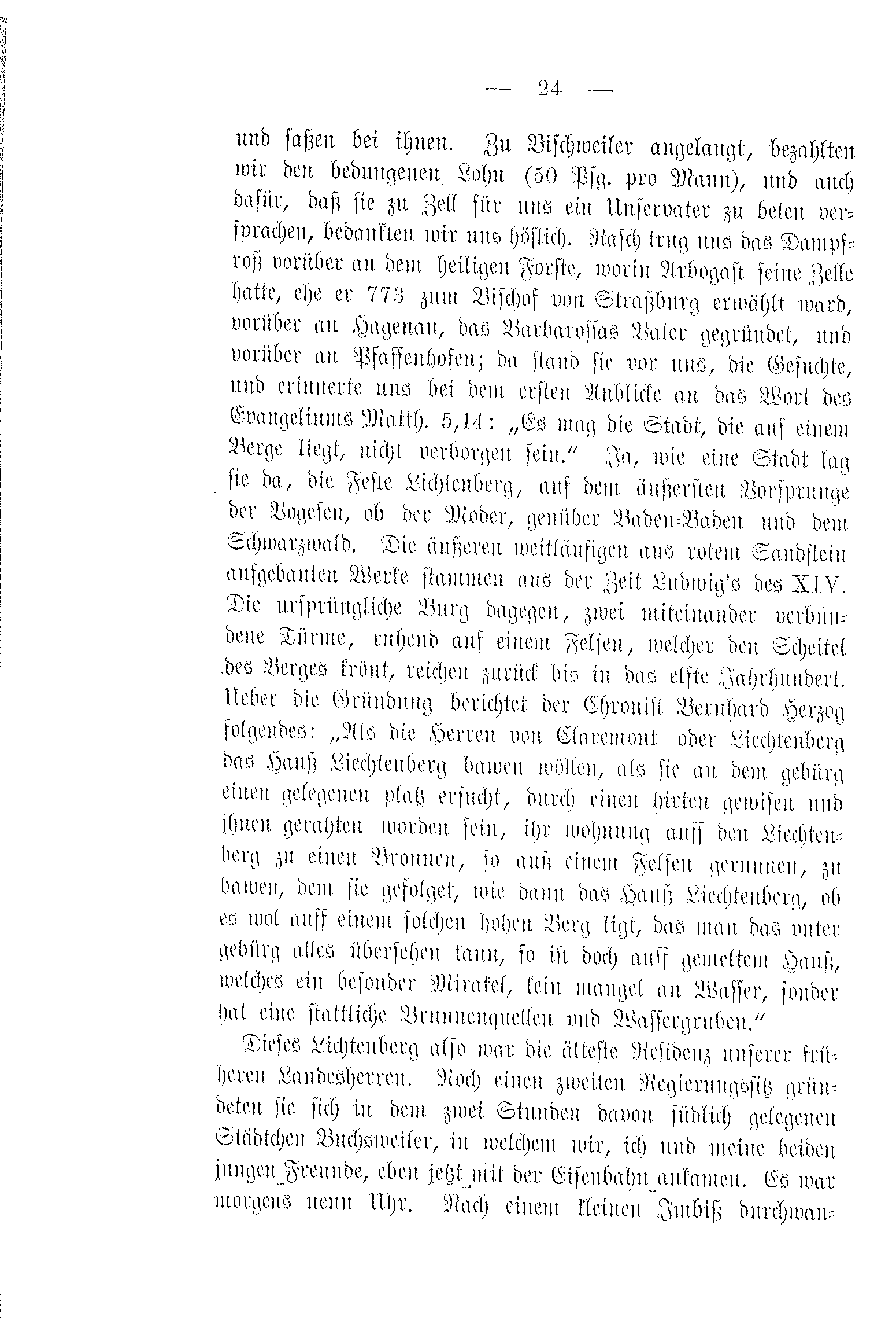 und saßen bei ihnen. Zu Bischweiler angelangt, bezahlten wir den bedungenen Lohn (50 Pfg. pro Mann), und auch dafür, daß sie zu Mariathal[1] für uns ein Unservater zu beten versprachen, bedankten wir uns höflich. Rasch trug uns das Dampfroß vorüber an dem heiligen Forste, worin Arbogast seine Zelle hatte, ehe er 773 zum Bischof von Straßburg erwählt ward, vorüber an Hagenau, das Barbarossas Vater gegründet, und vorüber an Pfaffenhofen; da stand sie vor uns, die Gesuchte, und erinnerte uns bei dem ersten Anblicke au das Wort des Evangeliums Matth. 5,14: „Es mag die Stadt, die auf einem Berge liegt, nicht verborgen sein.“ Ja, wie eine Stadt lag sie da, die Feste Lichtenberg, auf dem äußersten Vorsprunge der Vogesen, ob der Moder, genüber Baden-Baden und dem Schwarzwald. Die äußeren weitläufigen aus rotem Sandstein aufgebauten Werke stammen aus der Zeit Ludwigs des XIV. Die ursprüngliche Burg dagegen, zwei miteinander verbundene Türme, ruhend auf einem Felsen, welcher den Scheitel des Berges krönt, reichen zurück bis in das elfte Jahrhundert. Ueber die Gründung berichtet der Chronist Bernhard Herzog folgendes: „Als die Herren von Claremont oder Liechtenberg das Hauß Liechtenberg bawen wöllen, als sie an dem gebürg einen gelegenen platz ersucht, durch einen hirten gewisen und ihnen gerahten worden sein, ihr wohnung auff den Liechtenberg zu einen Bronnen, so auß einem Felsen gerunnen, zu bawen, dem sie gefolget, wie dann das Hauß Liechtenberg, ob es wol auff einem solchen hohen Berg ligt, das man das vnter gebürg alles übersehen kann, so ist doch auff gemeltem Hauß, welches ein besonder Mirakel, kein mangel an Wasser, sonder hat eine stattliche Brunnenquellen vnd Wassergruben.“