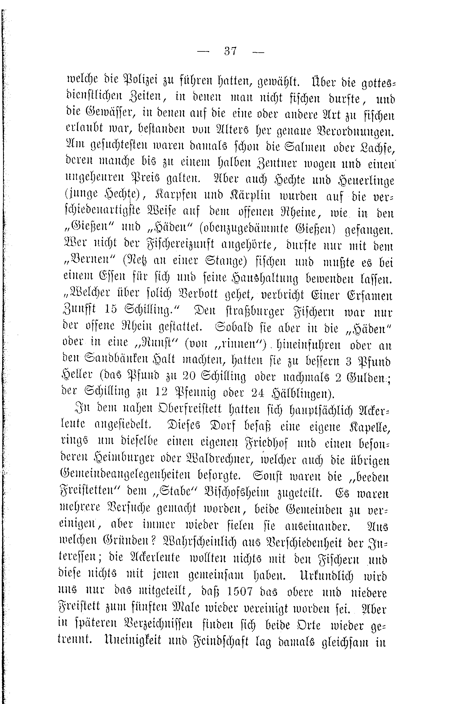 welche die Polizei zu führen hatten, gewählt. Über die gottesdienstlichen Zeiten, in denen man nicht fischen durfte, und die Gewässer, in denen auf die eine oder andere Art zu fischen erlaubt war, bestanden von Alters her genaue Verordnungen. Am gesuchtesten waren damals schon die Salmen oder Lachse, deren manche bis zu einem halben Zentner wogen und einen ungeheuren Preis galten. Aber auch Hechte und Heuerlinge (junge Hechte), Karpfen und Kärplin wurden auf die verschiedenartigste Weise auf dem offenen Rheine, wie in den „Gießen“ und „Häden“ (obenzugedämmte Gießen) gefangen. Wer nicht der Fischereizunft angehörte, durfte nur mit dem „Bernen“ (Netz an einer Stange) fischen und mußte es bei einem Essen für sich und seine Haushaltung bewenden lassen. „Welcher über solich Verbott gehet, verbricht Einer Ersamen Zunfft 15 Schilling.“ Den straßburger Fischern war nur der offene Rhein gestattet. Sobald sie aber in die „Häden“ oder in eine „Runst“ (von „rinnen“) hineinfuhren oder an den Sandbänken Halt machten, hatten sie zu bessern 3 Pfund Heller (das Pfund zu 20 Schilling oder nachmals 2 Gulden; der Schilling zu 12 Pfennig oder 24 Hälblingen).
