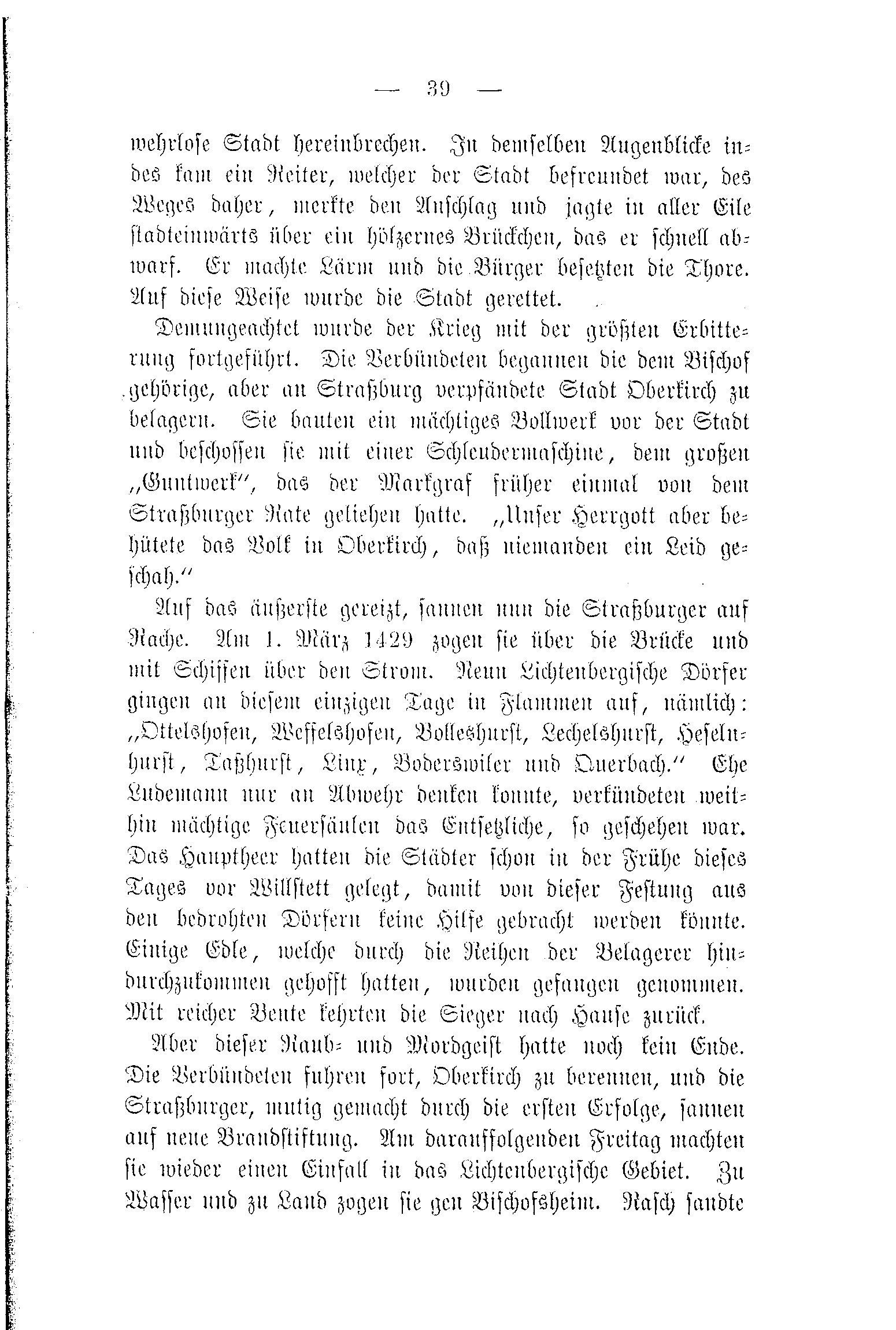 Aber dieser Raub- und Mordgeist hatte noch kein Ende. Die Verbündeten fuhren fort, Oberkirch zu berennen, und die Straßburger, mutig gemacht durch die ersten Erfolge, sannen auf neue Brandstiftung. Am darauffolgenden Freitag machten sie wieder einen Einfall in das Lichtenbergische Gebiet. Zu Wasser und zu Land zogen sie gen Bischofsheim. Rasch sandte