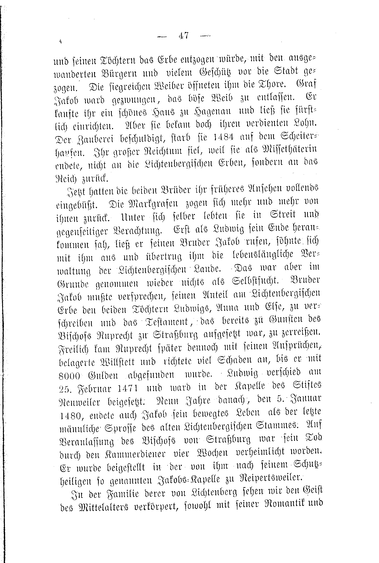 und seinen Töchtern das Erbe entzogen würde, mit den ausgewanderten Bürgern und vielem Geschütz vor die Stadt gezogen. Die siegreichen Weiber öffneten ihm die Thore. Graf Jakob ward gezwungen, das böse Weib zu entlassen. Er kaufte ihr ein schönes Haus zu Hagenau und ließ sie fürstlich einrichten. Aber sie bekam doch ihren verdienten Lohn. Der Zauberei beschuldigt, starb sie 1484 auf dem Scheiterhaufen. Ihr großer Reichtum fiel, weil sie als Missethäterin endete, nicht an die Lichtenbergischen Erben, sondern an das Reich zurück.