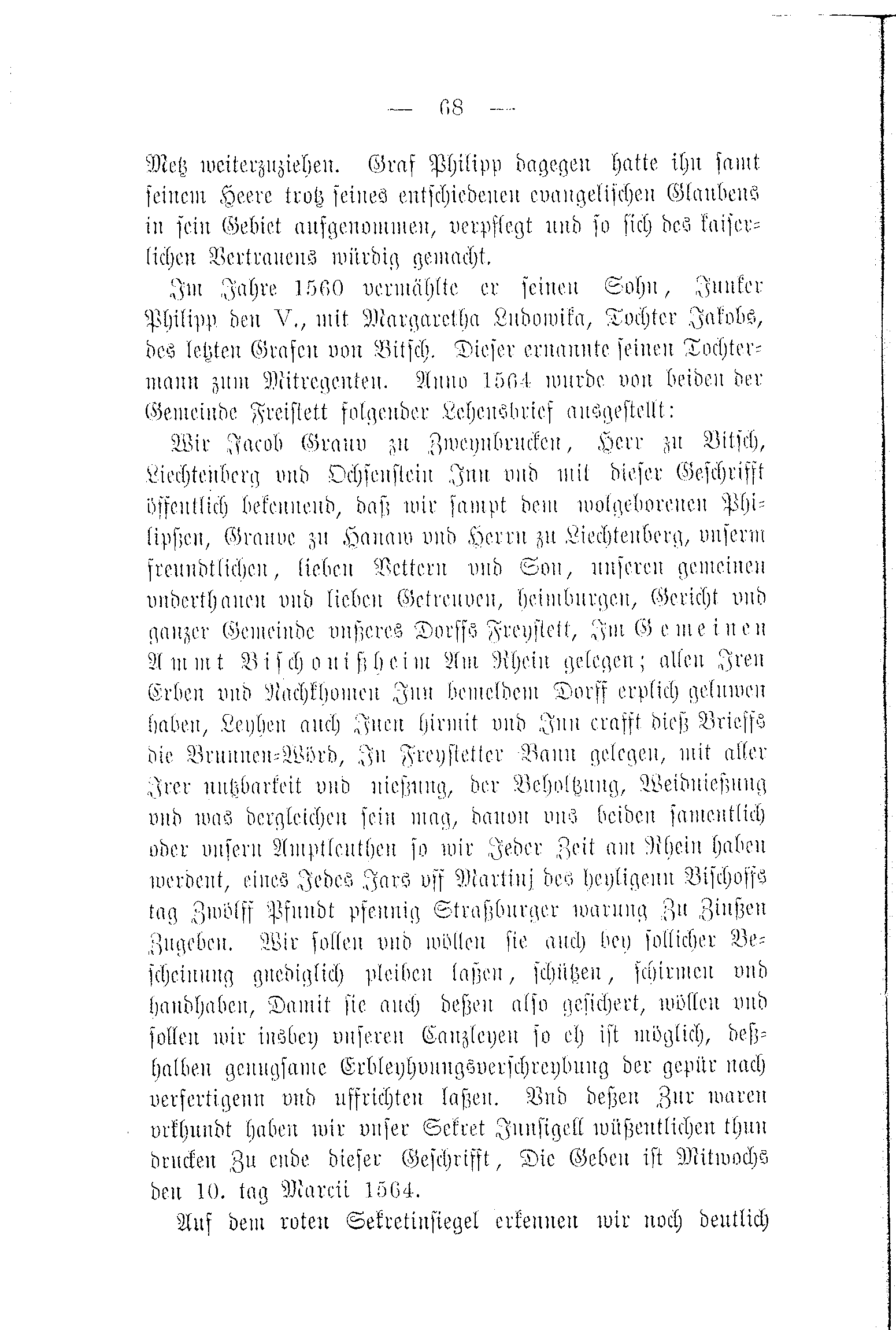 Wir Jacob Grauv zu Zweynbrucken, Herr zu Bitsch, Liechtenberg vnd Ochsenstein Inn vnd mit dieser Geschrifft öffentlich bekennend, daß wir sampt dem wolgeborenen Philipßen, Grauve zu Hanaw und Herrn zu Liechtenberg, vnserm freundtlichen, lieben Vettern vnd Son, unseren gemeinen vnderthanen vnd lieben Getreuven, heimburgen, Gericht vnd ganzer Gemeinde vnßeres Dorffs Freystett, Im Gemeinen Ammt Bischonißheim Am Rhein gelegen; allen Iren Erben vnd Nachkhomen Inn bemeldem Dorff erplich geluwen haben, Leyhen auch Inen hirmit vnd Inn crafft dieß Brieffs die Brunnen-Wörd, In Freystetter Bann gelegen, mit aller Irer nutzbarkeit vnd nießung, der Beholtzung, Weidnießung vnd was dergleichen sein mag, davon vns beiden samentlich oder vnsern Amptleuthen so wir Jeder Zeit am Rhein haben werdent, eines Jedes Jars vff Martinj des heyligenn Bischoffs tag Zwölff Pfundt pfennig Straßburger warung Zu Zinßen Zugeben. Wir sollen vnd wöllen sie auch bey sollicher Bescheinung gnediglich pleiben laßen, schützen, schirmen vnd handhaben, Damit sie auch deßen also gesichert, wöllen vnd sollen wir insbey vnseren Canzleyen so eh ist möglich, deßhalben genugsame Erbleyhvungsverschreybung der gepür nach verfertigenn vnd uffrichten laßen. Vnd deßen Zur waren vrkhundt haben wir vnser Sekret Jnnsigell wüßentlichen thun drucken Zu ende dieser Geschrifft, Die Geben ist Mitwochs den 10. tag Marcii 1564.