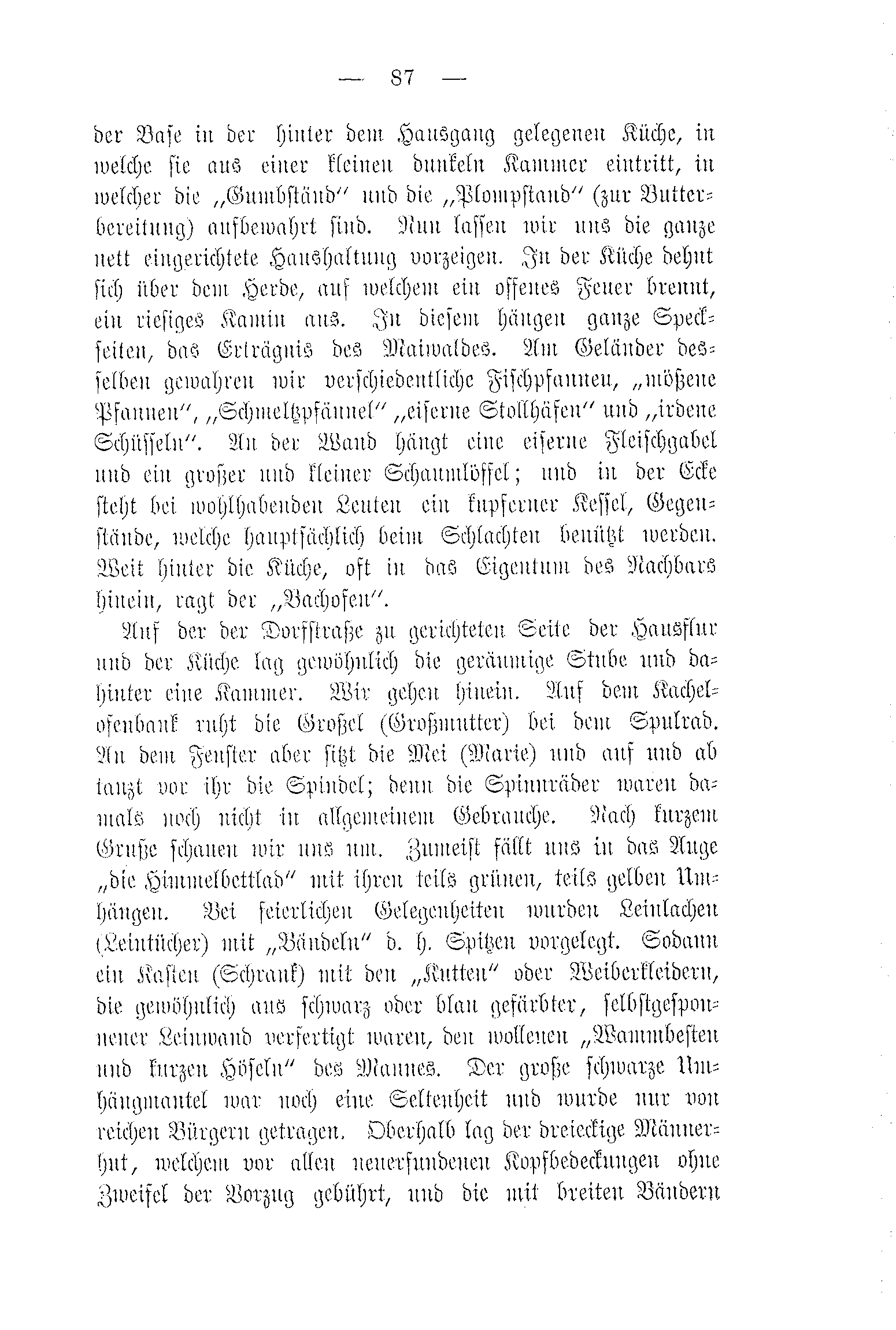 Auf der der Dorfstraße zu gerichteten Seite der Hausflur und der Küche lag gewöhnlich die geräumige Stube und dahinter eine Kammer. Wir gehen hinein. Anf dem Kachelofenbank ruht die Großel (Großmutter) bei dem Spulrad. An dem Fenster aber sitzt die Mei (Marie) und auf und ab tanzt vor ihr die Spindel; denn die Spinnräder waren damals noch nicht in allgemeinem Gebrauche. Nach kurzem Gruße schauen wir uns um. Zumeist fällt uns in das Auge „die Himmelbettlad“ mit ihren teils grünen, teils gelben Umhängen. Bei feierlichen Gelegenheiten wurden Leinlachen (Leintücher) mit „Bändeln“ d. h. Spitzen vorgelegt. Sodann ein Kasten (Schrank) mit den „Kutten“ oder Weiberkleidern, die gewöhnlich aus schwarz oder blau gefärbter, selbstgesponnener Leinwand verfertigt waren, den wollenen „Wammbesten und kurzen Höseln“ des Mannes. Der große schwarze Umhängmantel war noch eine Seltenheit und wurde nur von reichen Bürgern getragen. Oberhalb lag der dreieckige Männerhut, welchem vor allen neuerfundenen Kopfbedeckungen ohne Zweifel der Vorzug gebührt, und die mit breiten Bändern