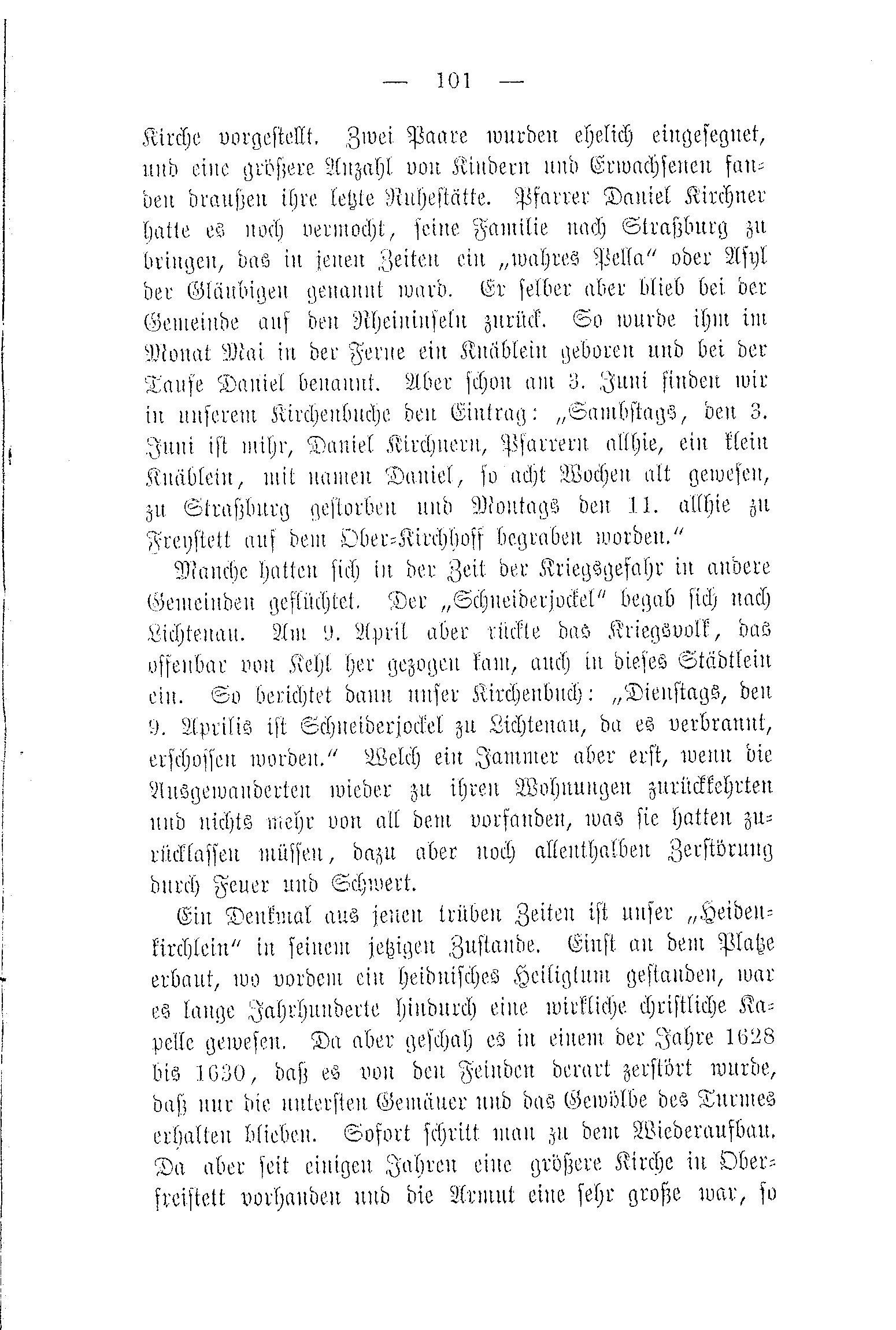 Kirche vorgestellt. Zwei Paare wurden ehelich eingesegnet, und eine größere Anzahl von Kindern und Erwachsenen fanden draußen ihre letzte Ruhestätte. Pfarrer Daniel Kirchner hatte es noch vermocht, seine Familie nach Straßburg zu bringen, das in jenen Zeiten ein „wahres Pella“ oder Asyl der Gläubigen genannt ward. Er selber aber blieb bei der Gemeinde auf den Rheininseln zurück. So wurde ihm im Monat Mai in der Ferne ein Knäblein geboren und bei der Taufe Daniel benannt. Aber schon am 3. Juni finden wir in unserem Kirchenbuche den Eintrag: „Sambstags, den 3. Juni ist mihr, Daniel Kirchnern, Pfarrern allhie, ein klein Knäblein, mit namen Daniel, so acht Wochen alt gewesen, zu Straßburg gestorben und Montags den 11. allhie zu Freystett auf dem Ober-Kirchhoff begraben worden.“