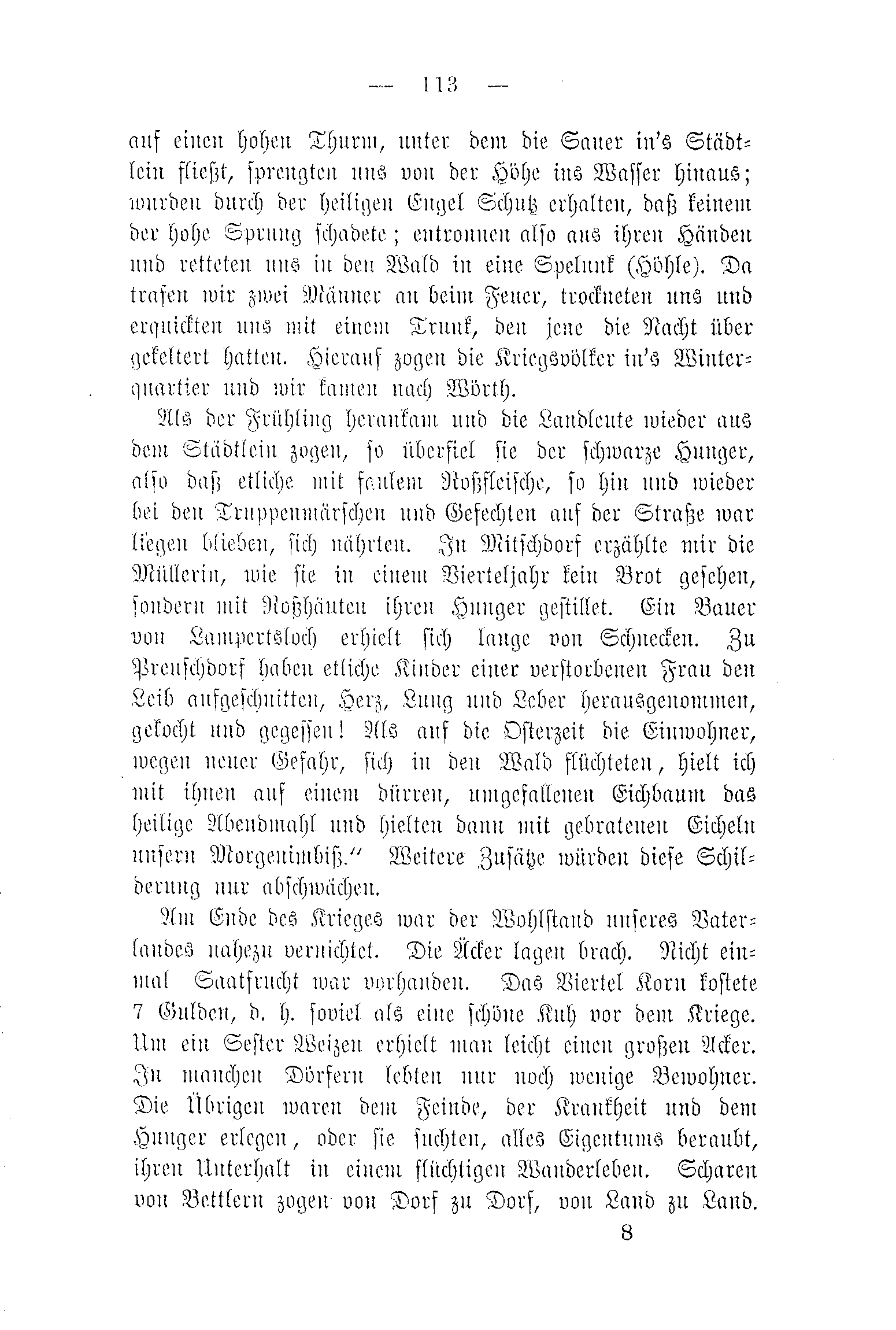 Als der Frühling herankam und die Landleute wieder aus dem Städtlein zogen, so überfiel sie der schwarze Hunger, also daß etliche mit faulem Roßfleische, so hin und wieder bei den Truppenmärschen und Gefechten auf der Straße war liegen blieben, sich nährten. In Mitschdorf erzählte mir die Müllerin, wie sie in einem Vierteljahr kein Brot gesehen, sondern mit Roßhäuten ihren Hunger gestillet. Ein Bauer von Lampertsloch erhielt sich lange von Schnecken. Zu Preuschdorf haben etliche Kinder einer verstorbenen Frau den Leib aufgeschnitten, Herz, Lung und Leber herausgenommen, gekocht und gegessen! Als auf die Osterzeit die Einwohner, wegen neuer Gefahr, sich in den Wald flüchteten, hielt ich mit ihnen auf einem dürren, umgefallenen Eichbaum das heilige Abendmahl und hielten dann mit gebratenen Eicheln unsern Morgenimbiß.“ Weitere Zusätze würden diese Schilderung nur abschwächen.