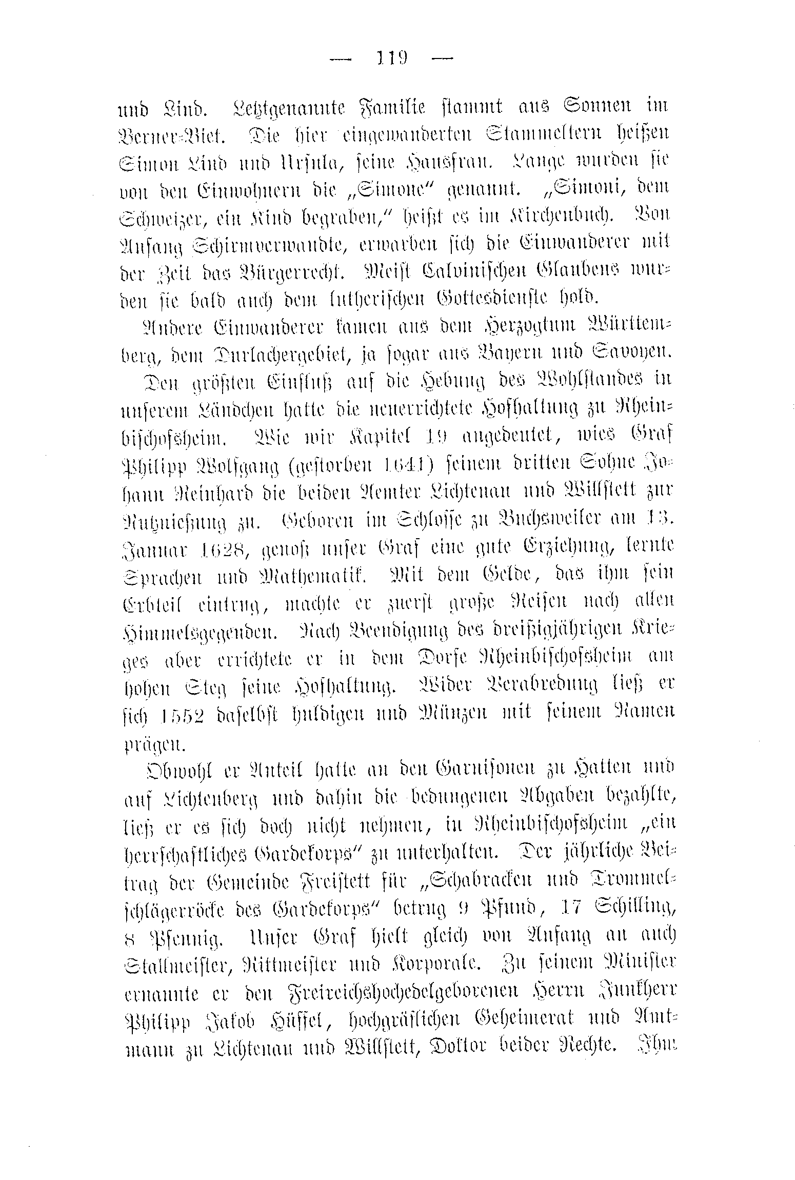 Den größten Einfluß auf die Hebung des Wohlstandes in unserem Ländchen hatte die neuerrichtete Hofhaltung zu Rheinbischofsheim. Wie wir Kapitel 19 angedeutet, wies Graf Philipp Wolfgang (gestorben 1641) seinem dritten Sohne Johann Reinhard die beiden Aemter Lichtenau und Willstett zur Nutznießung zu. Geboren im Schlosse zu Buchsweiler am 13. Januar 1628, genoß unser Graf eine gute Erziehung, lernte Sprachen und Mathematik. Mit dem Gelde, das ihm sein Erbteil eintrug, machte er zuerst große Reisen nach allen Himmelsgegenden. Nach Beendigung des dreißigjährigen Krieges aber errichtete er in dem Dorfe Rheinbischofsheim am hohen Steg seine Hofhaltung. Wider Verabredung ließ er sich 1652[1] daselbst huldigen und Münzen mit seinem Namen prägen.