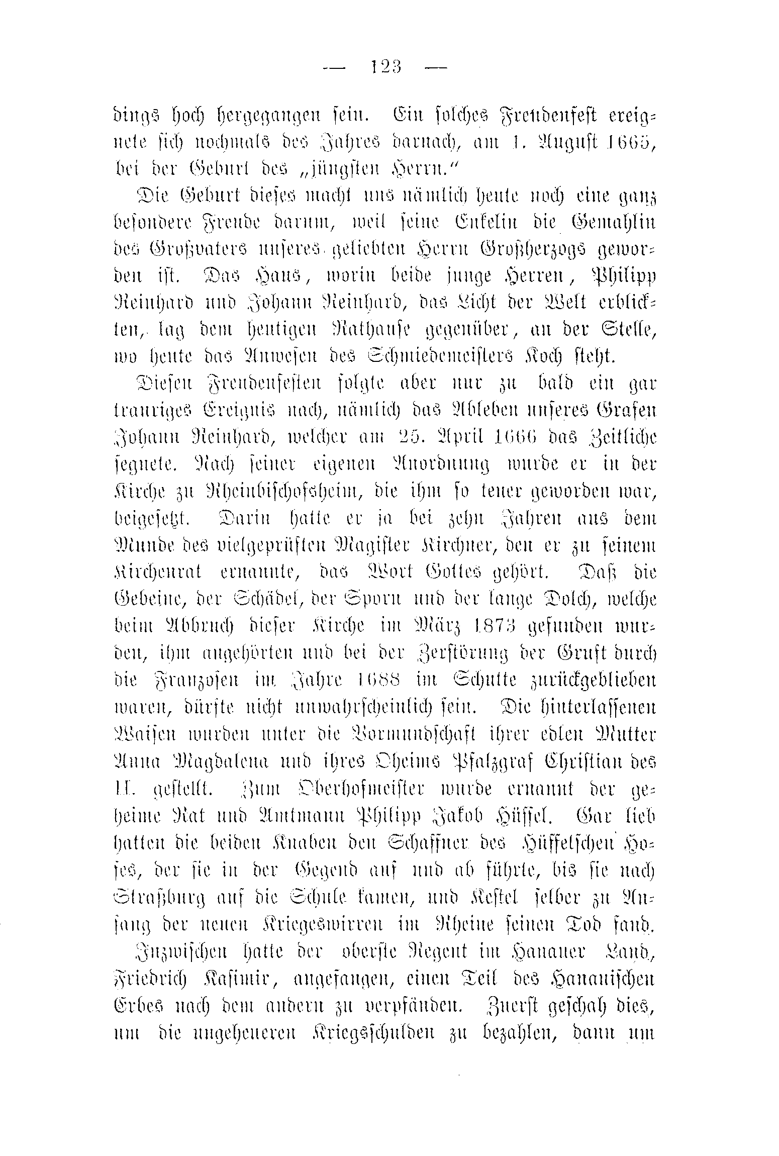 Diesen Frendenfesten folgte aber nur zu bald ein gar trauriges Ereignis nach, nämlich das Ableben unseres Grafen Johann Reinhard, welcher am 25. April 1666 das Zeitliche segnete. Nach seiner eigenen Anordnung wurde er in der Kirche zu Rheinbischofsheim, die ihm so teuer geworden war, beigesetzt. Darin hatte er ja bei zehn Jahren aus dem Munde des vielgeprüften Magister Kirchner, den er zu seinem Kirchenrat ernannte, das Wort Gottes gehört. Daß die Gebeine, der Schädel, der Sporn und der lange Dolch, welche beim Abbruch dieser Kirche im März 1873 gefunden wurden, ihm angehörten und bei der Zerstörung der Gruft durch die Franzosen im Jahre 1688 im Schutte zurückgeblieben waren, dürfte nicht unwahrscheinlich sein. Die hinterlassenen Waisen wurden unter die Vormundschaft ihrer edlen Mutter Anna Magdalena und ihres Oheims Pfalzgraf Christian des II. gestellt. Zum Oberhofmeister wurde ernannt der geheime Rat und Amtmann Philipp Jakob Hüffel. Gar lieb hatten die beiden Knaben den Schaffner des Hüffelschen Hofes, der sie in der Gegend auf und ab führte, bis sie nach Straßburg auf die Schule kamen, und Kestel selber zu Anfang der neuen Kriegeswirren im Rheine seinen Tod fand.
