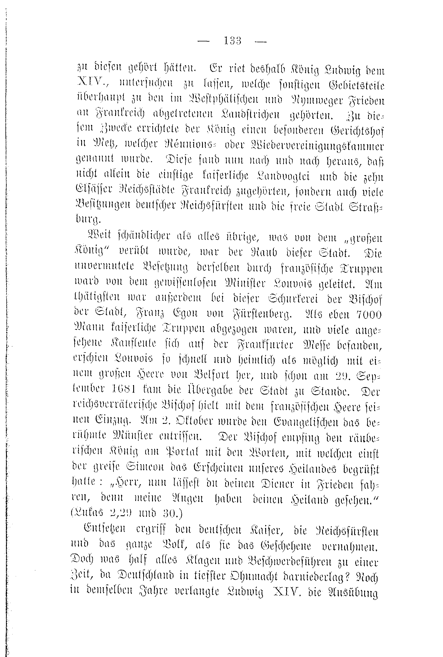 Weit schändlicher als alles übrige, was von dem „großen König“ verübt wurde, war der Raub dieser Stadt. Die unvermutete Besetzung derselben durch französische Truppen ward von dem gewissenlosen Minister Louvois geleitet. Am thätigsten war außerdem bei dieser Schurkerei der Bischof der Stadt, Franz Egon von Fürstenberg. Als eben 7000 Mann kaiserliche Truppen abgezogen waren, und viele angesehene Kaufleute sich auf der Frankfurter Messe befanden, erschien Louvois so schnell und heimlich als möglich mit einem großen Heere von Belfort her, und schon am 29. September 1681 kam die Übergabe der Stadt zu Stande. Der reichsverräterische Bischof hielt mit dem französischen Heere seinen Einzug. Am 2. Oktober wurde den Evangelischen das berühmte Münster entrissen. Der Bischof empfing den räuberischen König am Portal mit den Worten, mit welchen einst der greise Simeon das Erscheinen unseres Heilandes begrüßt hatte: „Herr, nun lässest du deinen Diener in Frieden fahren, denn meine Augen haben deinen Heiland gesehen.“ (Lukas 2,29 und 30.)