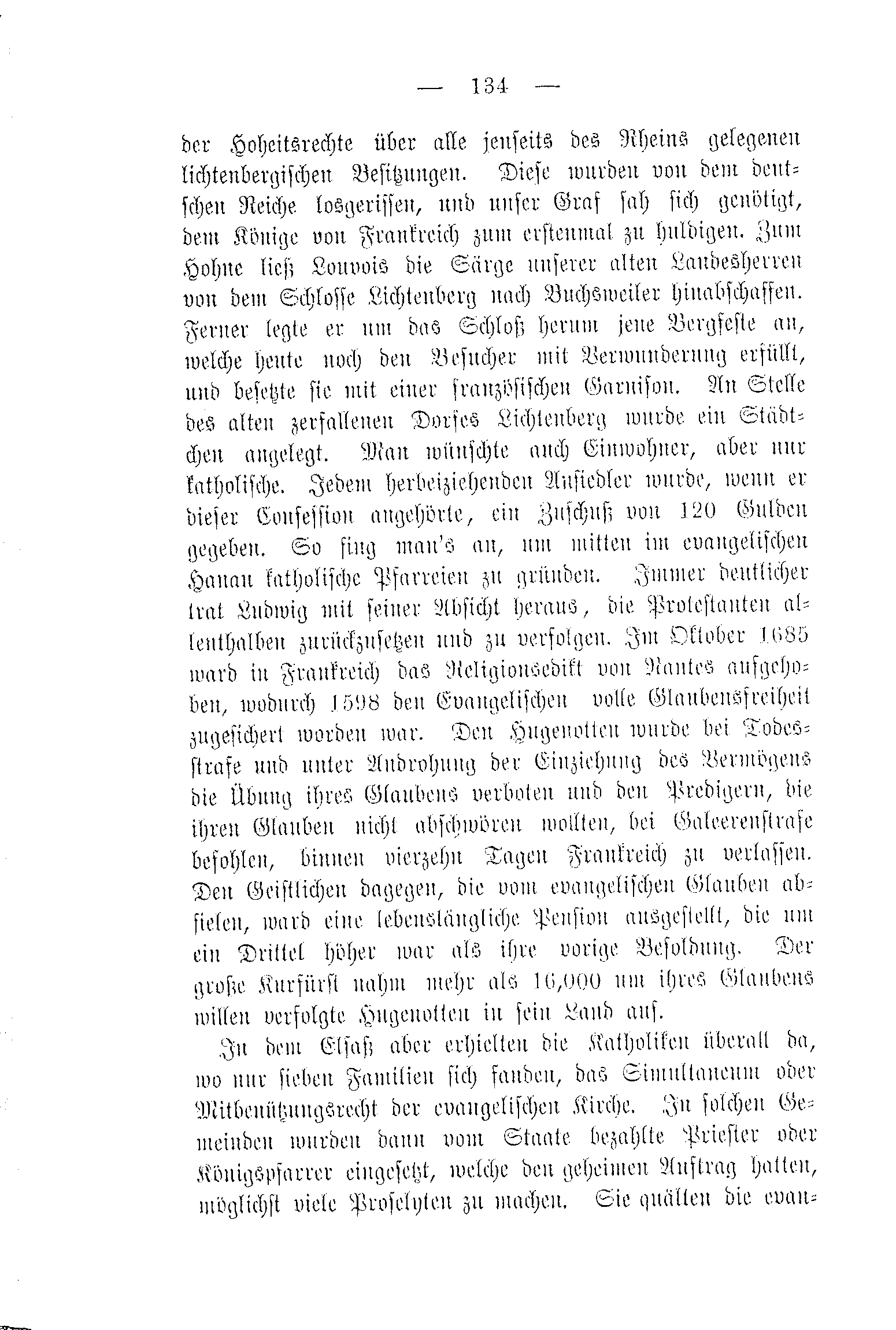 der Hoheitsrechte über alle jenseits des Rheins gelegenen lichtenbergischen Besitzungen. Diese wurden von dem deutschen Reiche losgerissen, und unser Graf sah sich genötigt, dem Könige von Frankreich zum erstenmal zu huldigen. Zum Hohne ließ Louvois die Särge unserer alten Landesherren von dem Schlosse Lichtenberg nach Buchsweiler hinabschaffen. Ferner legte er um das Schloß herum jene Bergfeste an, welche heute noch den Besucher mit Verwunderung erfüllt, und besetzte sie mit einer französischen Garnison. An Stelle des alten zerfallenen Dorfes Lichtenberg wurde ein Städtchen angelegt. Man wünschte auch Einwohner, aber nur katholische. Jedem herbeiziehenden Ansiedler wurde, wenn er dieser Confession angehörte, ein Zuschuß von 120 Gulden gegeben. So fing man's an, um mitten im evangelischen Hanau katholische Pfarreien zu gründen. Immer deutlicher trat Ludwig mit seiner Absicht heraus, die Protestanten allenthalben zurückzusetzen und zu verfolgen. Im Oktober 1685 ward in Frankreich das Religionsedikt von Nantes aufgehoben, wodurch 1598 den Evangelischen volle Glaubensfreiheit zugesichert worden war. Den Hugenotten wurde bei Todesstrafe und unter Androhung der Einziehung des Vermögens die Übung ihres Glaubens verboten und den Predigern, die ihren Glauben nicht abschwören wollten, bei Galeerenstrafe befohlen, binnen vierzehn Tagen Frankreich zu verlassen. Den Geistlichen dagegen, die vom evangelischen Glauben abfielen, ward eine lebenslängliche Pension ausgestellt, die um ein Drittel höher war als ihre vorige Besoldung. Der große Kurfürst nahm mehr als 16,000 um ihres Glaubens willen verfolgte Hugenotten in sein Land auf.