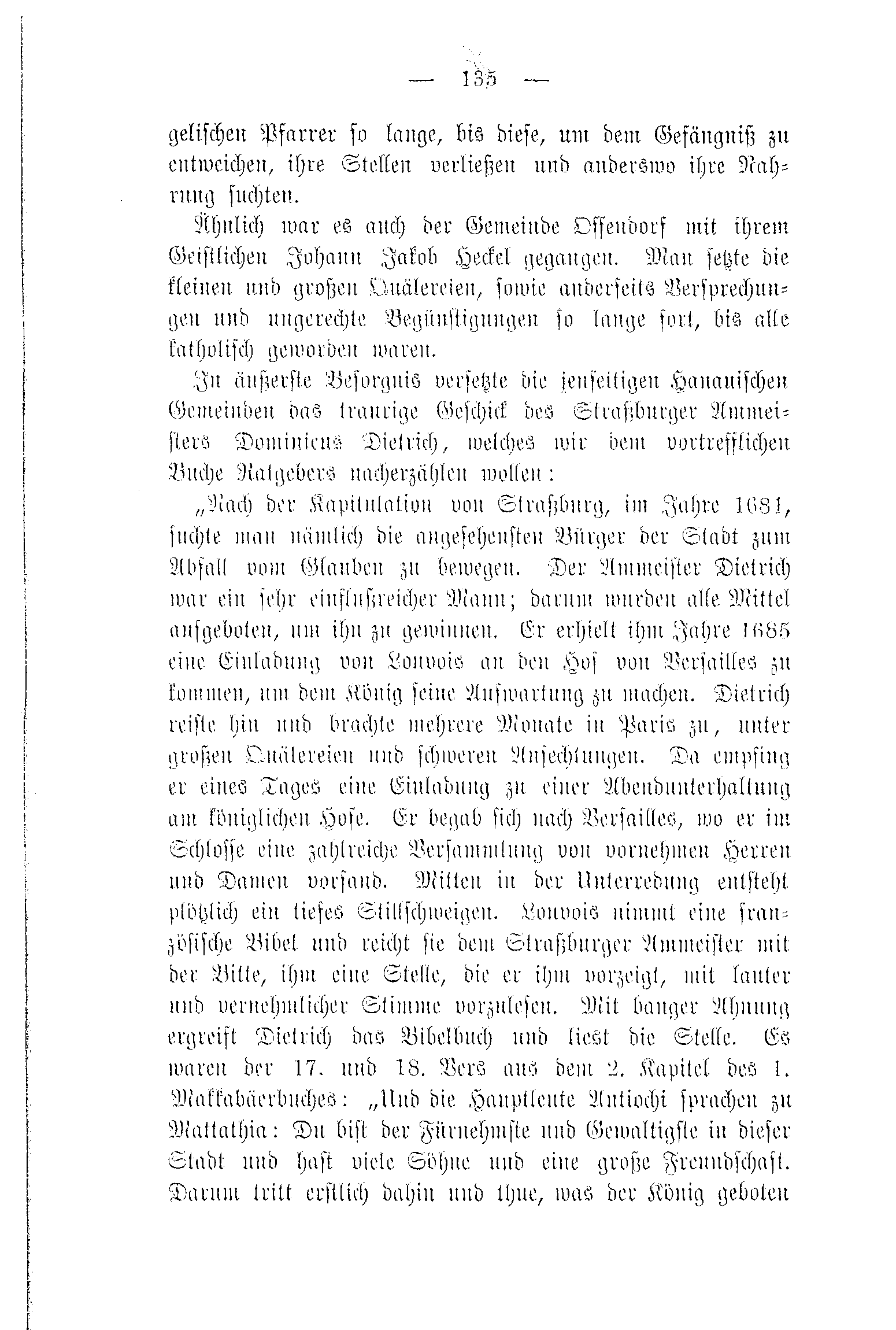 „Nach der Kapitulation von Straßburg, im Jahre 1681, suchte man nämlich die angesehensten Bürger der Stadt zum Abfall vom Glauben zu bewegen. Der Ammeister Dietrich war ein sehr einflußreicher Mann; darum wurden alle Mittel aufgeboten, um ihn zu gewinnen. Er erhielt im Jahre 1685 eine Einladung von Louvois an den Hof von Versailles zu kommen, um dem König seine Aufwartung zu machen. Dietrich reiste hin und brachte mehrere Monate in Paris zu, unter großen Quälereien und schweren Anfechtungen. Da empfing er eines Tages eine Einladung zu einer Abendunterhaltung am königlichen Hofe. Er begab sich nach Versailles, wo er im Schlosse eine zahlreiche Versammlung von vornehmen Herren und Damen vorfand. Mitten in der Unterredung entsteht plötzlich ein tiefes Stillschweigen. Louvois nimmt eine französische Bibel und reicht sie dem Straßburger Ammeister mit der Bitte, ihm eine Stelle, die er ihm vorzeigt, mit lauter und vernehmlicher Stimme vorzulesen. Mit banger Ahnung ergreift Dietrich das Bibelbuch und liest die Stelle. Es waren der 17. und 18. Vers aus dem 2. Kapitel des 1. Makkabäerbuches: „Und die Hauptleute Antiochi sprachen zu Mattathia: Du bist der Fürnehmste und Gewaltigste in dieser Stadt und hast viele Söhne und eine große Freundschaft. Darum tritt erstlich dahin und thue, was der König geboten