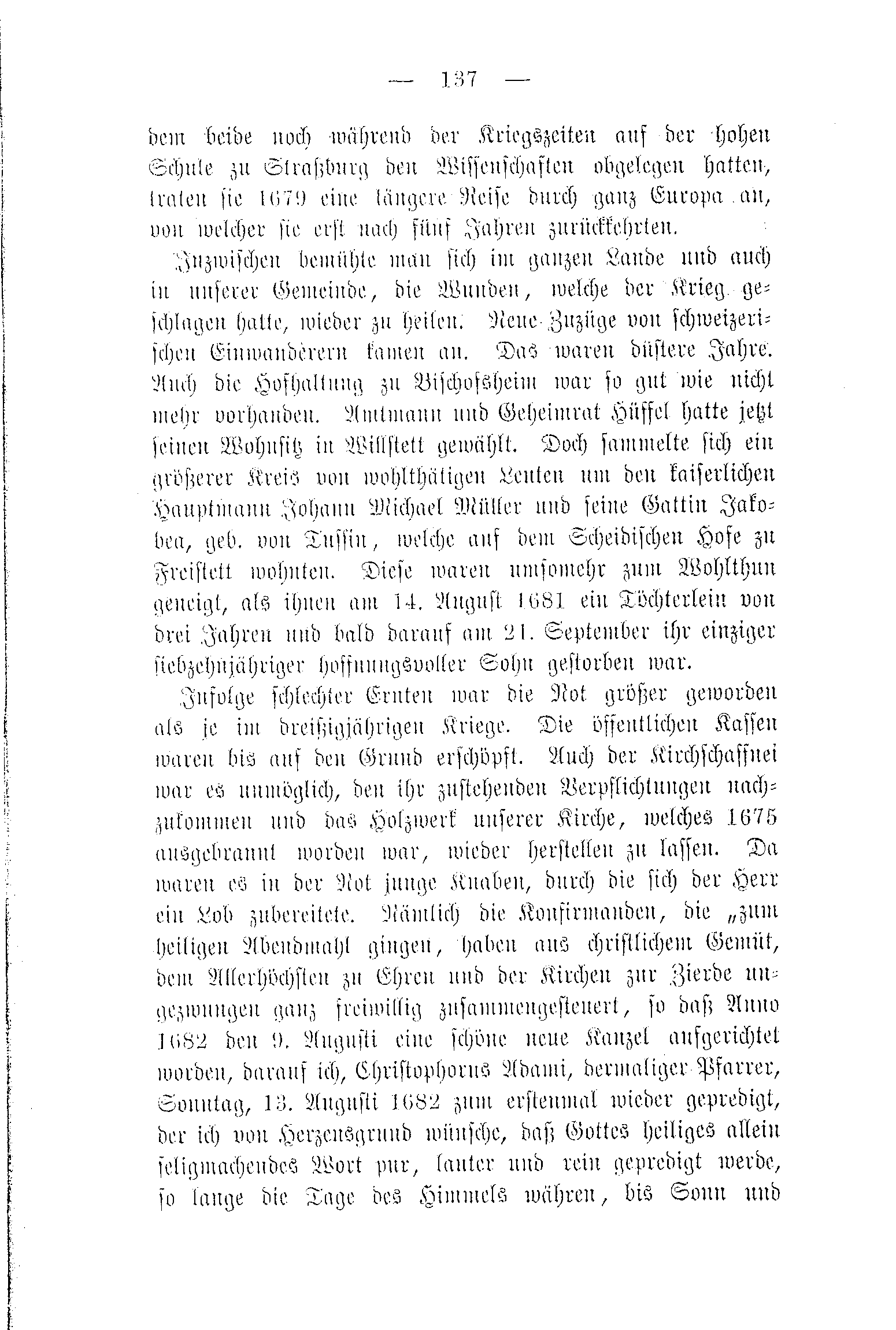 Inzwischen bemühte man sich im ganzen Lande und auch in unserer Gemeinde, die Wunden, welche der Krieg geschlagen hatte, wieder zu heilen. Neue Zuzüge von schweizerischen Einwanderern kamen an. Das waren düstere Jahre. Auch die Hofhaltung zu Bischofsheim war so gut wie nicht mehr vorhanden. Amtmann und Geheimrat Hüffel hatte jetzt seinen Wohnsitz in Willstett gewählt. Doch sammelte sich ein größerer Kreis von wohlthätigen Leuten um den kaiserlichen Hauptmann Johann Michael Müller und seine Gattin Jakobea, geb. von Tussin, welche auf dem Scheidischen Hofe zu Freistett wohnten. Diese waren umsomehr zum Wohlthun geneigt, als ihnen am 14. August 1681 ein Töchterlein von drei Jahren und bald darauf am 21. September ihr einziger siebzehnjähriger hoffnungsvoller Sohn gestorben war.