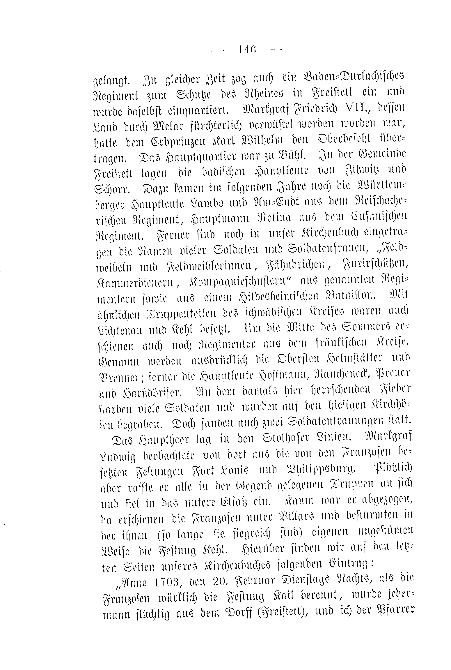 gelangt. Zu gleicher Zeit zog auch ein Baden-Durlachisches Regiment zum Schutze des Rheines in Freistett ein und wurde daselbst einquartiert. Markgraf Friedrich VII., dessen Land durch Melac fürchterlich verwüstet worden worden war, hatte dem Erbprinzen Karl Wilhelm den Oberbefehl übertragen. Das Hauptquartier war zu Bühl. In der Gemeinde Freistett lagen die badischen Hauptleute von Zitzwitz und Schorr. Dazu kamen im folgenden Jahre noch die Württemberger Hauptleute Lambo und Am-Endt aus dem Reischacherischen Regiment, Hauptmann Rotina aus dem Cusanischen Regiment. Ferner sind noch in unser Kirchenbuch eingetragen die Namen vieler Soldaten und Soldatenfrauen, „Feldweibeln und Feldweiblerinnen, Fähndrichen, Furirschützen, Kammerdienern, Kompagnieschustern“ aus genannten Regimentern sowie aus einem Hildesheimischen Bataillon. Mit ähnlichen Truppenteilen des schwäbischen Kreises waren auch Lichtenau und Kehl besetzt. Um die Mitte des Sommers erschienen auch noch Regimenter ans dem fränkischen Kreise. Genannt werden ausdrücklich die Obersten Helmstätter und Brenner; ferner die Hauptleute Hoffmann, Raucheneck, Preuer und Harßdörffer. An dem damals hier herrschenden Fieber starben viele Soldaten und wurden auf den hiesigen Kirchhöfen begraben. Doch fanden auch zwei Soldatentrauungen statt.