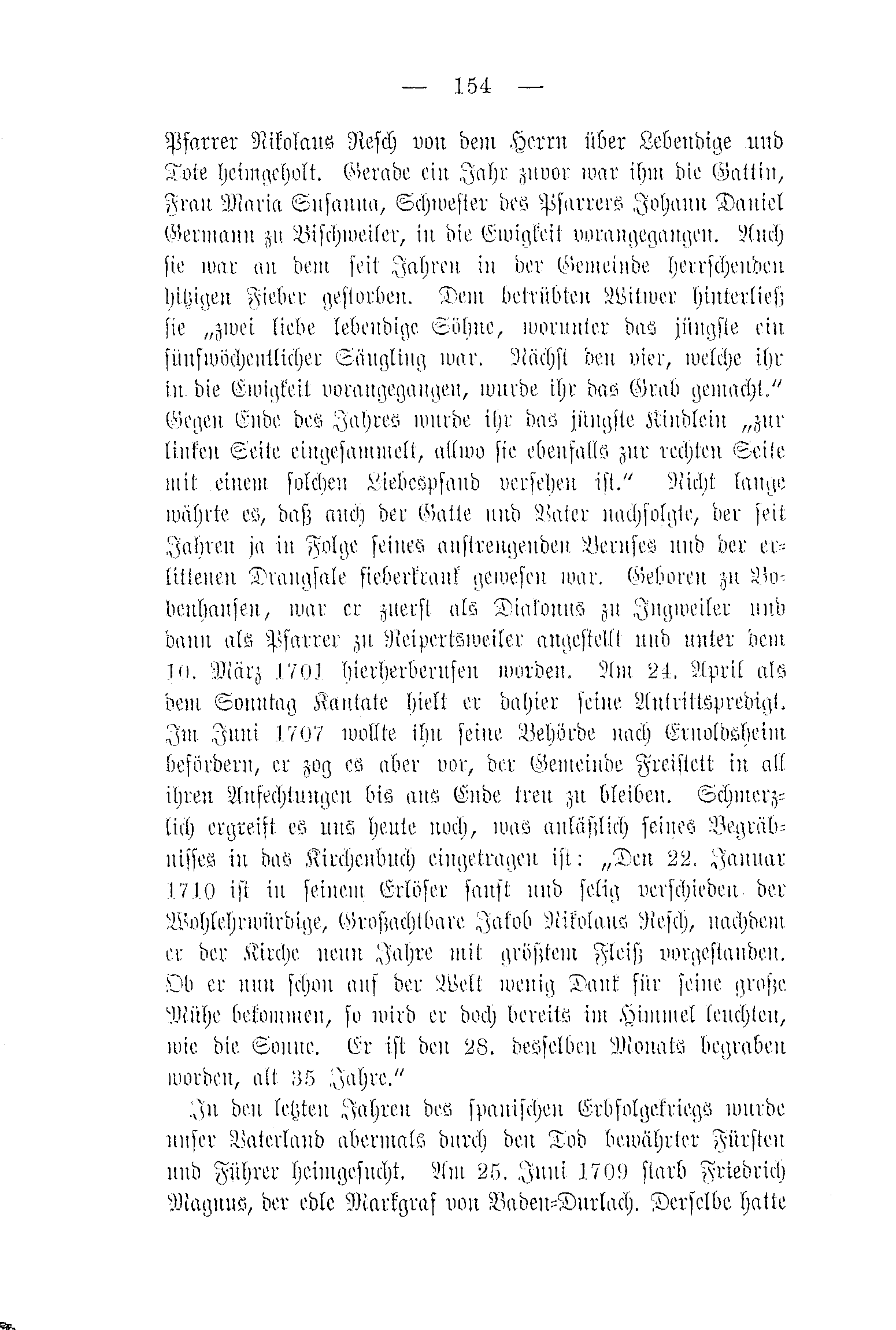 Pfarrer Nikolaus Resch von dem Herrn über Lebendige und Tote heimgeholt. Gerade ein Jahr zuvor war ihm die Gattin, Frau Maria Susanna, Schwester des Pfarrers Johann Daniel Germann zu Bischweiler, in die Ewigkeit vorangegangen. Auch sie war an dem seit Jahren in der Gemeinde herrschenden hitzigen Fieber gestorben. Dem betrübten Witwer hinterließ sie „zwei liebe lebendige Söhne, worunter das jüngste ein fünfwöchentlicher Säugling war. Nächst den vier, welche ihr in die Ewigkeit vorangegangen, wurde ihr das Grab gemacht.“ Gegen Ende des Jahres wurde ihr das jüngste Kindlein „zur linken Seite eingesammelt, allwo sie ebenfalls zur rechten Seite mit einem solchen Liebespfand versehen ist.“ Nicht lange währte es, daß auch der Gatte und Vater nachfolgte, der seit Jahren ja in Folge seines anstrengenden Berufes und der erlittenen Drangsale fieberkrank gewesen war. Geboren zu Bobenhausen, war er zuerst als Diakonus zu Ingweiler und dann als Pfarrer zu Reipertsweiler angestellt und unter dem 10. März 1701 hierherberufen worden. Am 24. April als dem Sonntag Kantate hielt er dahier seine Antrittspredigt. Im Juni 1707 wollte ihn seine Behörde nach Ernoldsheim befördern, er zog es aber vor, der Gemeinde Freistett in all ihren Anfechtungen bis ans Ende treu zu bleiben. Schmerzlich ergreift es uns heute noch, was anläßlich seines Begräbnisses in das Kirchenbuch eingetragen ist: „Den 22. Januar 1710 ist in seinem Erlöser sanft und selig verschieden der Wohlehrwürdige, Großachtbare Jakob Nikolaus Resch, nachdem er der Kirche neun Jahre mit größtem Fleiß vorgestanden. Ob er nun schon auf der Welt wenig Dank für seine große Mühe bekommen, so wird er doch bereits im Himmel leuchten, wie die Sonne. Er ist den 28. desselben Monats begraben worden, alt 35 Jahre.“