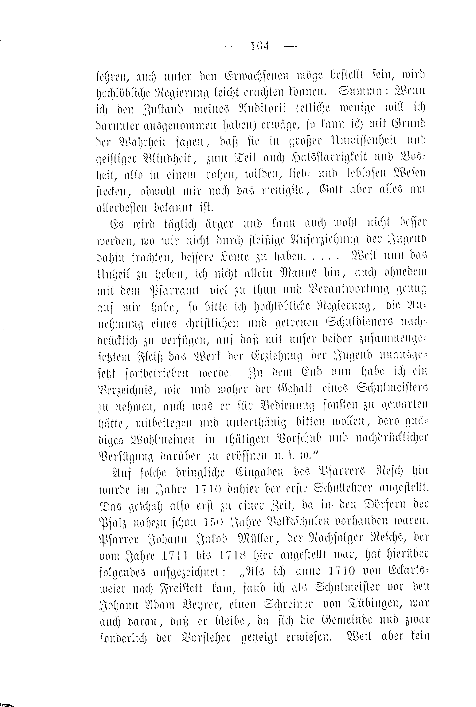 Es wird täglich ärger und kann auch wohl nicht besser werden, wo wir nicht durch fleißige Auferziehung der Jugend dahin trachten, bessere Leute zu haben..... Weil nun das Unheil zu heben, ich nicht allein Manns bin, auch ohnedem mit dem Pfarramt viel zu thun und Verantwortung genug auf mir habe, so bitte ich hochlöbliche Regierung, die Annehmung eines christlichen und getreuen Schuldieners nachdrücklich zu verfügen, auf daß mit unser beider zusammengesetztem Fleiß das Werk der Erziehung der Jugend unausgesetzt fortbetrieben werde. Zu dem End nun habe ich ein Verzeichnis, wie und woher der Gehalt eines Schulmeisters zu nehmen, auch was er für Bedienung sonsten zu gewarten hätte, mitbeilegen und unterthänig bitten wollen, dero gnädiges Wohlmeinen in thätigem Vorschub und nachdrücklicher Verfügung darüber zu eröffnen u. s. w.“