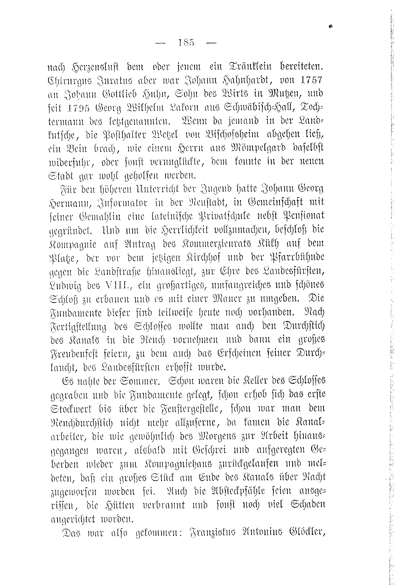 nach Herzenslust dem oder jenem ein Tränklein bereiteten. Chirurgus Juratus aber war Johann Hahnhardt, von 1757 an Johann Gottlieb Huhn, Sohn des Wirts in Mutzen, und seit 1795 Georg Wilhelm Lakorn aus Schwäbisch-Hall, Tochtermann des letztgenannten. Wenn da jemand in der Landkutsche, die Posthalter Wetzel von Bischofsheim abgehen ließ, ein Bein brach, wie einem Herrn aus Mömpelgard daselbst widerfuhr, oder sonst verunglückte, dem konnte in der neuen Stadt gar wohl geholfen werden.