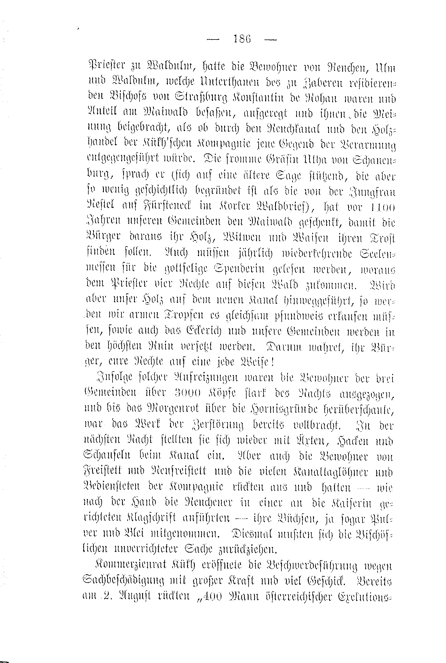 Priester zu Waldulm, hatte die Bewohner von Renchen, Ulm und Waldulm, welche Unterthanen des zu Zaberen residierenden Bischofs von Straßburg Konstantin de Rohan waren und Anteil am Maiwald besaßen, aufgeregt und ihnen die Meinung beigebracht, als ob durch den Renchkanal und den Holzhandel der Kükh'schen Kompagnie jene Gegend der Verarmung entgegengeführt würde. Die fromme Gräfin Utha von Schauenburg, sprach er (sich auf eine ältere Sage stützend, die aber so wenig geschichtlich begründet ist als die von der Jungfrau Nestel aus Fürsteneck im Korker Waldbrief), hat vor 1100 Jahren unseren Gemeinden den Maiwald geschenkt, damit die Bürger daraus ihr Holz, Witwen und Waisen ihren Trost finden sollen. Auch müssen jährlich wiederkehrende Seelenmessen für die gottselige Spenderin gelesen werden, woraus dem Priester vier Rechte auf diesen Wald zukommen. Wird aber unser Holz auf dem neuen Kanal hinweggeführt, so werden wir armen Tropfen es gleichsam pfundweis erkaufen müssen, sowie auch das Eckerich und unsere Gemeinden werden in den höchsten Ruin versetzt werden. Darum wahret, ihr Bürger, eure Rechte auf eine jede Weise!