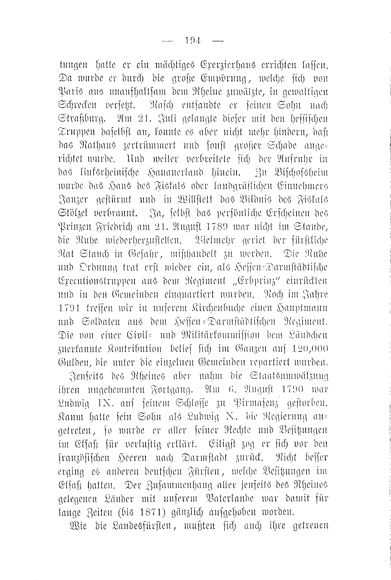 hatte er ein mächtiges Exerzierhaus errichten lassen. Da wurde er durch die große Empörung, welche sich von Paris aus unaufhaltsam dem Rheine zuwälzte, in gewaltigen Schrecken versetzt. Rasch entsandte er seinen Sohn nach Straßburg. Am 21. Juli gelangte dieser mit den hessischen Truppen daselbst an, konnte es aber nicht mehr hindern, daß das Rathaus zertrümmert und sonst großer Schade angerichtet wurde. Und weiter verbreitete sich der Aufruhr in das linksrheinische Hanauerland hinein. Zu Bischofsheim wurde das Haus des Fiskals oder landgräflichen Einnehmers Janzer gestürmt und in Willstett das Bildnis des Fiskals Stölzel verbrannt. Ja, selbst das persönliche Erscheinen des Prinzen Friedrich am 21. August 1789 war nicht im Stande, die Ruhe wiederherzustellen. Vielmehr geriet der fürstliche Rat Stauch in Gefahr, mißhandelt zu werden. Die Ruhe und Ordnung trat erst wieder ein, als Hessen-Darmstädtische Executionstruppen aus dem Regiment „Erbprinz“ einrückten und in den Gemeinden einquartiert wurden. Noch im Jahre 1791 treffen wir in unserem Kirchenbuche einen Hauptmann und Soldaten aus dem Hessen-Darmstädtischen Regiment. Die von einer Civil- und Militärkommission dem Ländchen zuerkannte Kontribution belief sich im Ganzen auf 120,000 Gulden, die unter die einzelnen Gemeinden repartiert wurden.