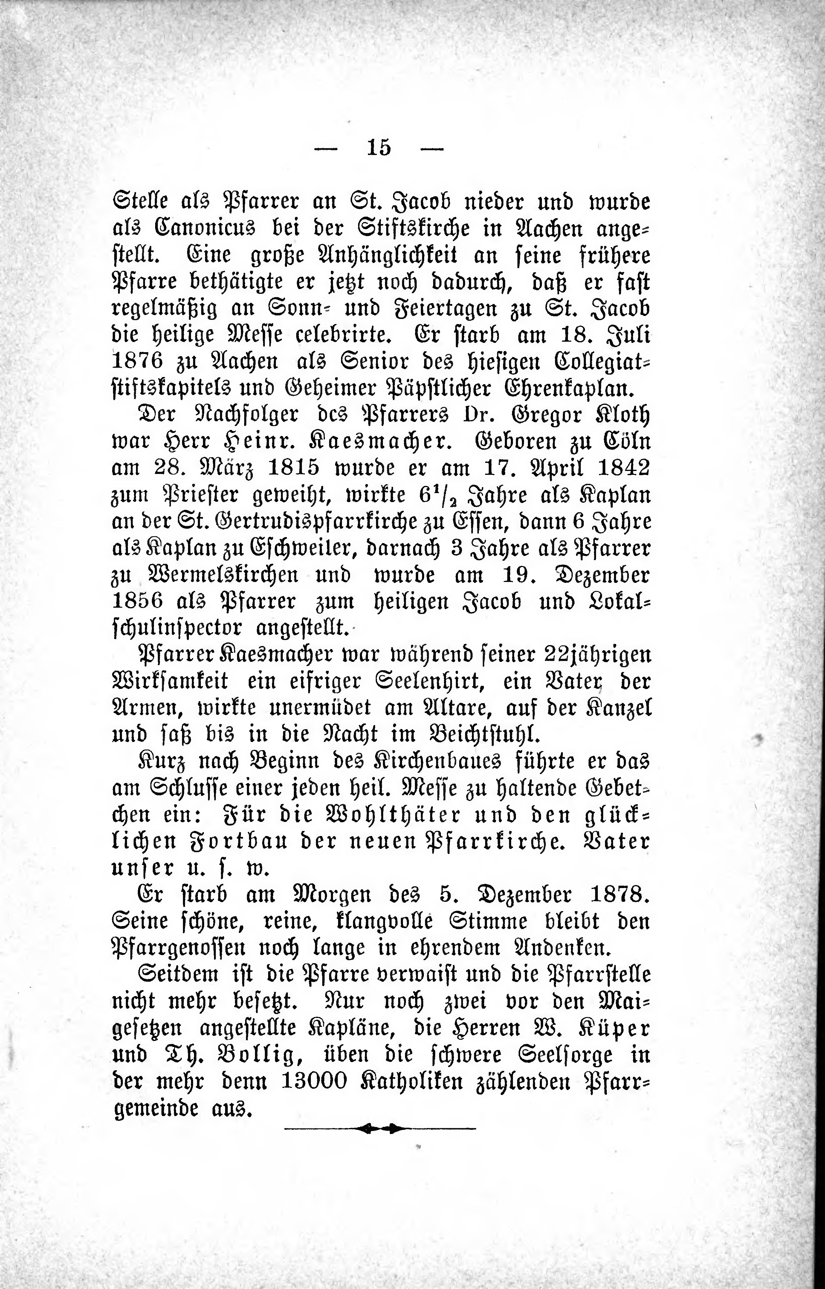 Der Nachfolger des Pfarrers Dr. Gregor Kloth war Herr Heinr. Kaesmacher. Geboren zu Cöln am 28. Marz 1815 wurde er am 17. April 1842 zum Priester geweiht, wirkte 61/2 Jahre als Kaplan an der St. Gertrudispfarrkirche zu Essen, dann 6 Jahre als Kaplan zu Eschweiler, darnach 3 Jahre als Pfarrer zu Wermelskirchen und wurde am 19. Dezember 1856 als Pfarrer zum heiligen Jacob und Lokalschulinspector angestellt.