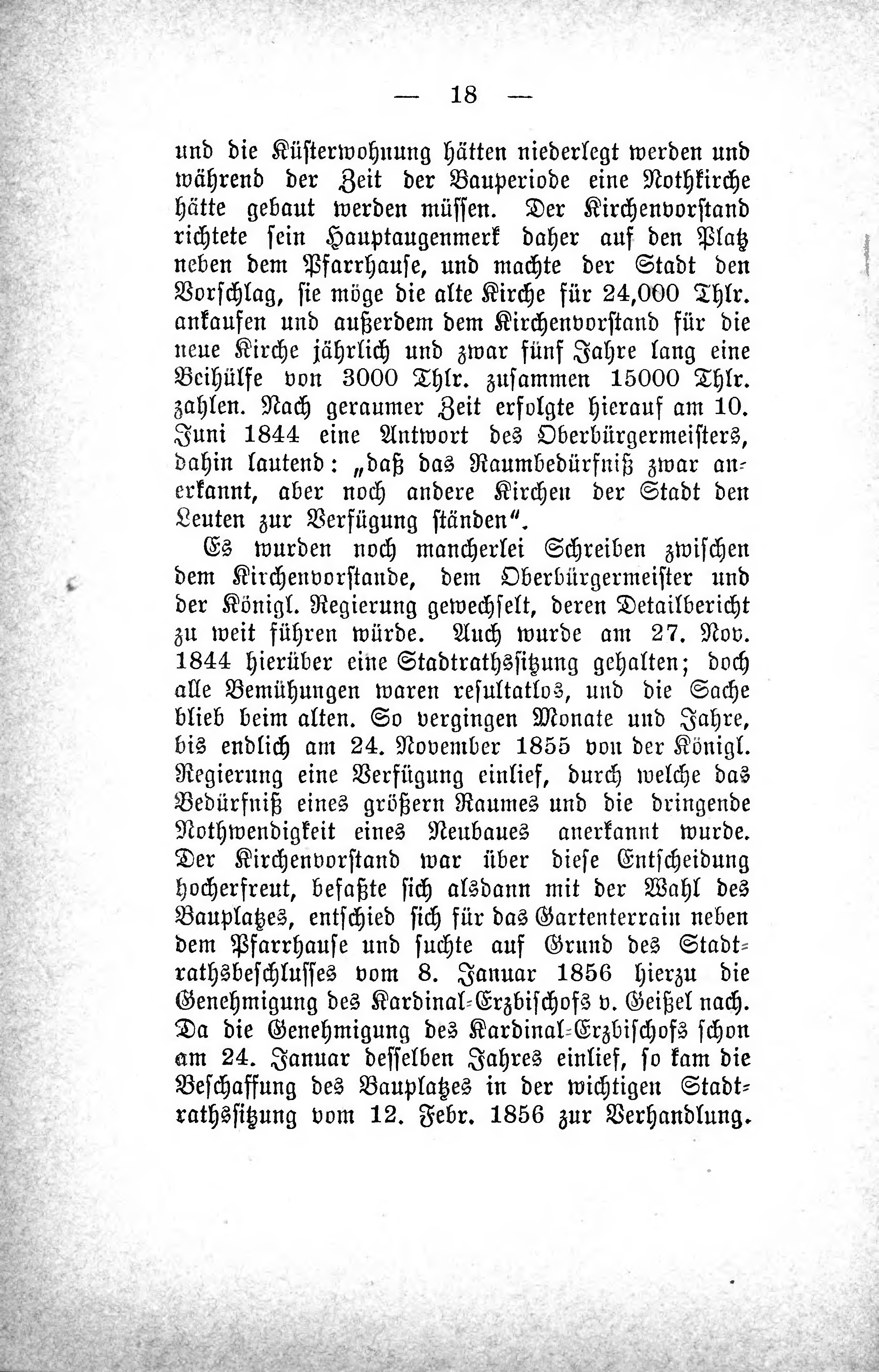 Es wurden noch mancherlei Schreiben zwischen dem Kirchenvorstande, dem Oberbürgermeister und der Königl. Regierung gewechselt, deren Detailbericht zu weit führen würde. Auch wurde am 27. Nov. 1844 hierüber eine Stadtrathssitzung gehalten; doch alle Bemühungen waren resultatlos, und die Sache blieb beim alten. So vergingen Monate und Jahre, bis endlich am 24. November 1855 von der Königl. Regierung eine Verfügung einlief, durch welche das Bedürfniß eines größern Raumes und die dringende Notwendigkeit eines Neubaues anerkannt wurde. Der Kirchenvorstand war über diese Entscheidung hocherfreut, befaßte sich alsdann mit der Wahl des Bauplatzes, entschied sich für das Gartenterrain neben dem Pfarrhause und suchte auf Grund des Stadtrathsbeschlusses vom 8. Januar 1856 hierzu die Genehmigung des Kardinal-Erzbischofs v. Geißel nach. Da die Genehmigung des Kardinal-Erzbischofs schon am 24. Januar desselben Jahres einlief, so kam die Beschaffung des Bauplatzes in der wichtigen Stadtrathssitzung vom 12. Febr. l856 zur Verhandlung.