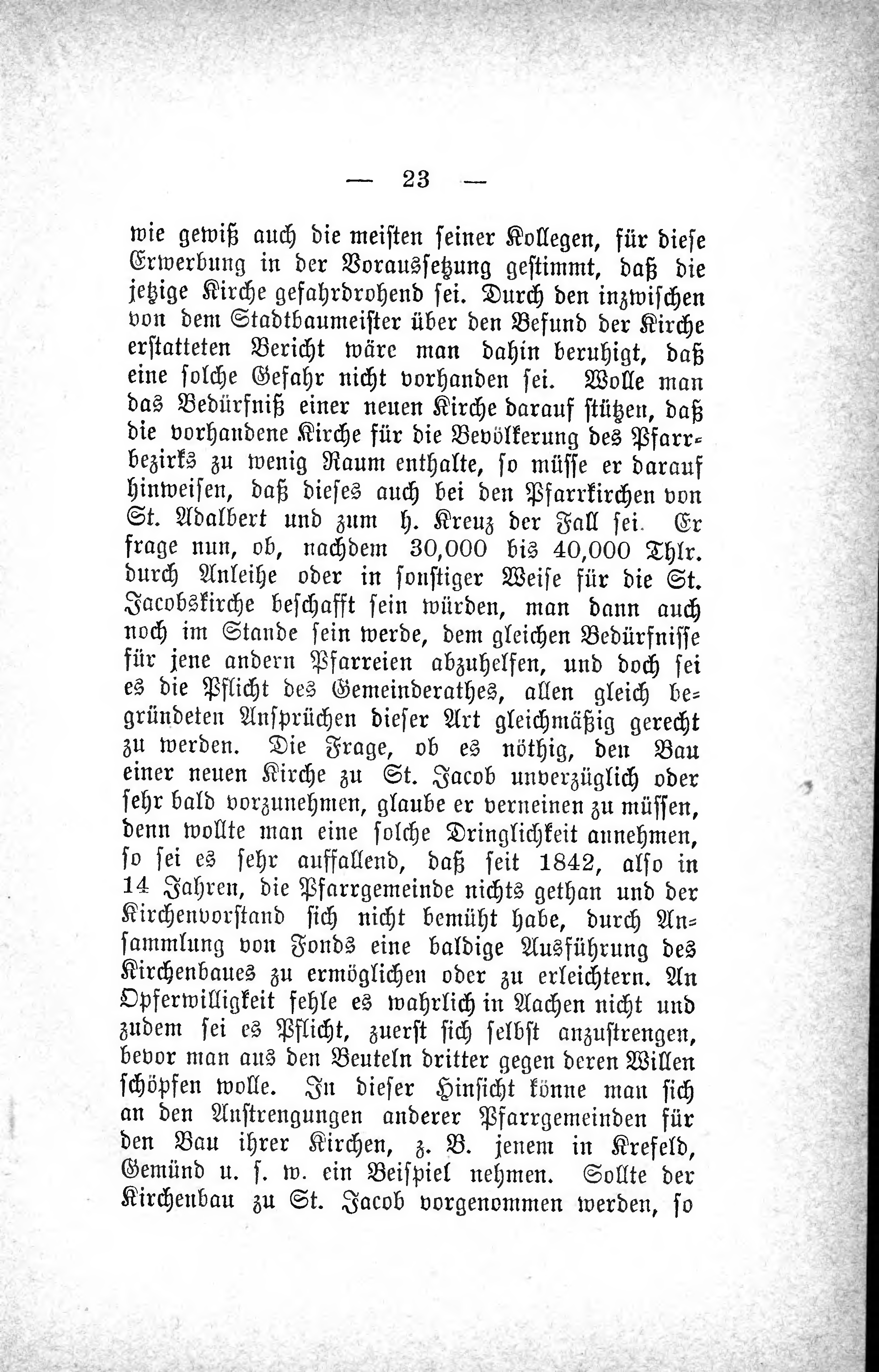 wie gewiß auch die meisten seiner Kollegen, für diese Erwerbung in der Voraussetzung gestimmt, daß die jetzige Kirche gefahrdrohend sei. Durch den inzwischen von dem Stadtbaumeister über den Befund der Kirche erstatteten Bericht wäre man dahin beruhigt, das eine solche Gefahr nicht vorhanden sei. Wolle man das Bedürfniß einer neuen Kirche darauf stützen, daß die vorhandene Kirche für die Bevölkerung des Pfarrbezirks zu wenig Raum enthalte, so müsse er darauf hinweisen, daß dieses auch bei den Pfarrkirchen von St. Adalbert und zum h. Kreuz der Fall sei. Er frage nun, ob, nachdem 30,000 bis 40,000 Thlr. durch Anleihe oder in sonstiger Weise für die St. Jacobskirche beschafft sein würden, man dann auch noch im Stande sein werde, dem gleichen Bedürfnisse für jene andern Pfarreien abzuhelfen, und doch sei es die Pflicht des Gemeinderathes, allen gleich begründeten Ansprüchen dieser Art gleichmäßig gerecht zu werden. Die Frage, ob es nöthig, den Bau einer neuen Kirche zu St. Jacob unverzüglich oder sehr bald vorzunehmen, glaube er verneinen zu müssen, denn wollte man eine solche Dringlichkeit annehmen, so sei es sehr auffallend, das seit 1842, also in 14 Jahren, die Pfarrgemeinde nichts gethan und der Kirchenvorstand sich nicht bemüht habe, durch Ansammlung von Fonds eine baldige Ausführung des Kirchenbaues zu ermöglichen oder zu erleichtern. An Opferwilligkeit fehle es wahrlich in Aachen nicht und zudem sei es Pflicht, zuerst sich selbst anzustrengen, bevor man aus den Beuteln dritter gegen deren Willen schöpfen wolle. In dieser Hinsicht könne man sich an den Anstrengungen anderer Pfarrgemeinden für den Bau ihrer Kirchen, z. B. jenem in Krefeld, Gemünd u. s. w. ein Beispiel nehmen. Sollte der Kirchenbau zu St. Jacob vorgenommen werden, so