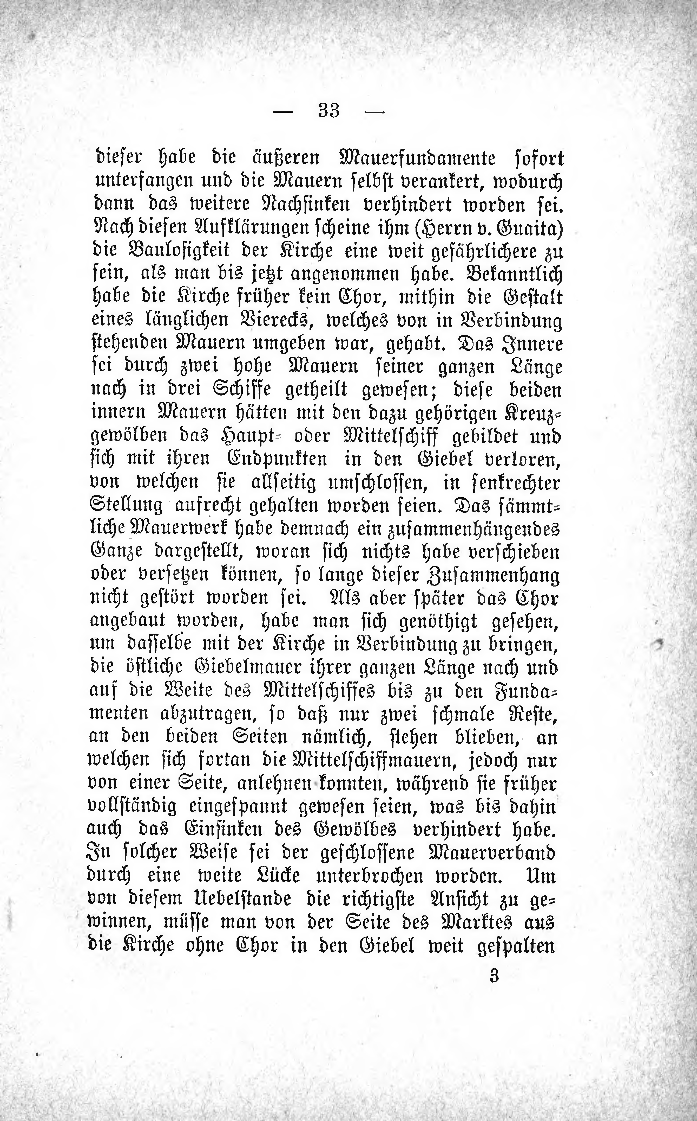 dieser habe die äußeren Mauerfundamente sofort unterfangen und die Mauern selbst verankert, wodurch dann das weitere Nachsinken verhindert worden sei. Nach diesen Aufklärungen scheine ihm (Herrn v. Guaita) die Baulosigkeit der Kirche eine weit gefährlichere zu sein, als man bis jetzt angenommen habe. Bekanntlich habe die Kirche früher kein Chor, mithin die Gestalt eines länglichen Vierecks, welches von in Verbindung stehenden Mauern umgeben war, gehabt. Das Innere sei durch zwei hohe Mauern seiner ganzen Länge nach in drei Schiffe getheilt gewesen; diese beiden innern Mauern hätten mit den dazu gehörigen Kreuzgewölben das Haupt- oder Mittelschiff gebildet und sich mit ihren Endpunkten in den Giebel verloren, von welchen sie allseitig umschlossen, in senkrechter Stellung aufrecht gehalten worden seien. Das sämmtliche Mauerwerk habe demnach ein zusammenhängendes Ganze dargestellt, woran sich nichts habe verschieben oder versetzen können, so lange dieser Zusammenhang nicht gestört worden sei. Als aber später das Chor angebaut worden, habe man sich genöthigt gesehen, um dasselbe mit der Kirche in Verbindung zu bringen, die östliche Giebelmauer ihrer ganzen Länge nach und auf die Weite des Mittelschiffes bis zu den Fundamenten abzutragen, so daß nur zwei schmale Reste, an den beiden Seiten nämlich, stehen blieben, an welchen sich fortan die Mittelschiffmauern, jedoch nur von einer Seite, anlehnen konnten, während sie früher vollständig eingespannt gewesen seien, was bis dahin auch das Einsinken des Gewölbes verhindert habe. In solcher Weise sei der geschlossene Mauerverband durch eine weite Lücke unterbrochen worden. Um von diesem Uebelstande die richtigste Ansicht zu gewinnen, müsse man von der Seite des Marktes aus die Kirche ohne Chor in den Giebel weit gespalten