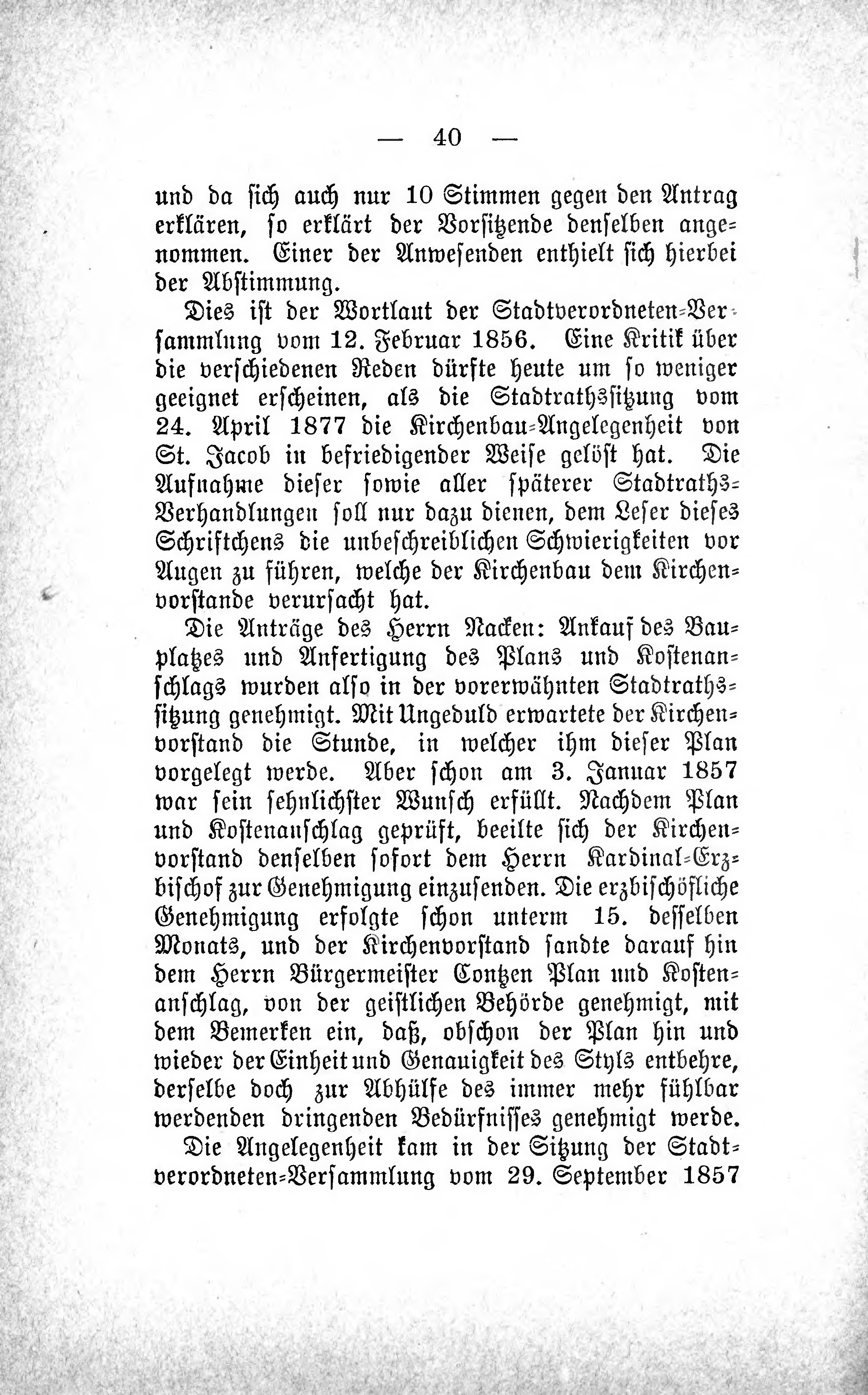 Dies ist der Wortlaut der Stadtverordneten-Versammlung vom 12. Februar 1856. Eine Kritik über die verschiedenen Reden dürfte heute um so weniger geeignet erscheinen, als die Stadtrathssitzung vom 24. April 1877 die Kirchenbau-Angelegenheit von St. Jacob in befriedigender Weise gelöst hat. Die Aufnahme dieser sowie aller späterer Stadtrats-Verhandlungen soll nur dazu dienen, dem Leser dieses Schriftchens die unbeschreiblichen Schwierigkeiten vor Augen zu führen, welche der Kirchenbau dem Kirchenvorstande verursacht hat.
