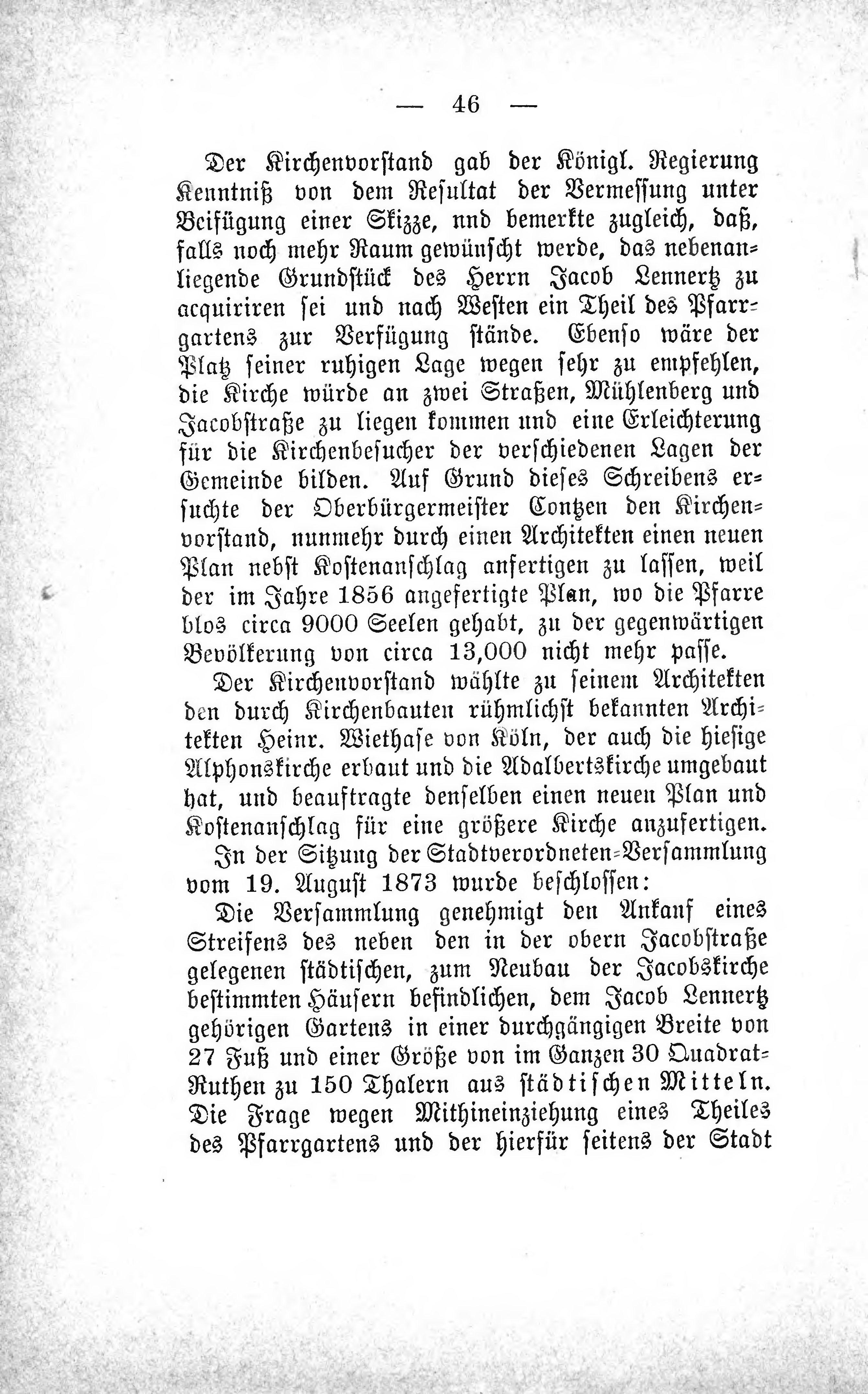 Der Kirchenvorstand gab der Königl. Regiernng Kenntniß von dem Resultat der Vermessung unter Beifügung einer Skizze, und bemerkte zugleich, daß, falls noch mehr Raum gewünscht werde, das nebenanliegende Grundstück des Herrn Jacob Lennertz zu acguiriren sei und nach Westen ein Theil des Pfarrgartens zur Verfügung stände. Ebenso wäre der Platz seiner ruhigen Lage wegen sehr zu empfehlen, die Kirche würde an zwei Straßen, Mühlenberg und Jacobstraße zu liegen kommen und eine Erleichterung für die Kirchenbesucher der verschiedenen Lagen der Gemeinde bilden. Auf Grund dieses Schreibens ersuchte der Oberbürgermeister Contzen den Kirchenvorstand, nunmehr durch einen Architekten einen neuen Plan nebst Kostenanschlag anfertigen zu lassen, weil der im Jahre 1856 angefertigte Plan, wo die Pfarre blos circa 9000 Seelen gehabt, zu der gegenwärtigen Bevölkerung von circa 13,000 nicht mehr passe.