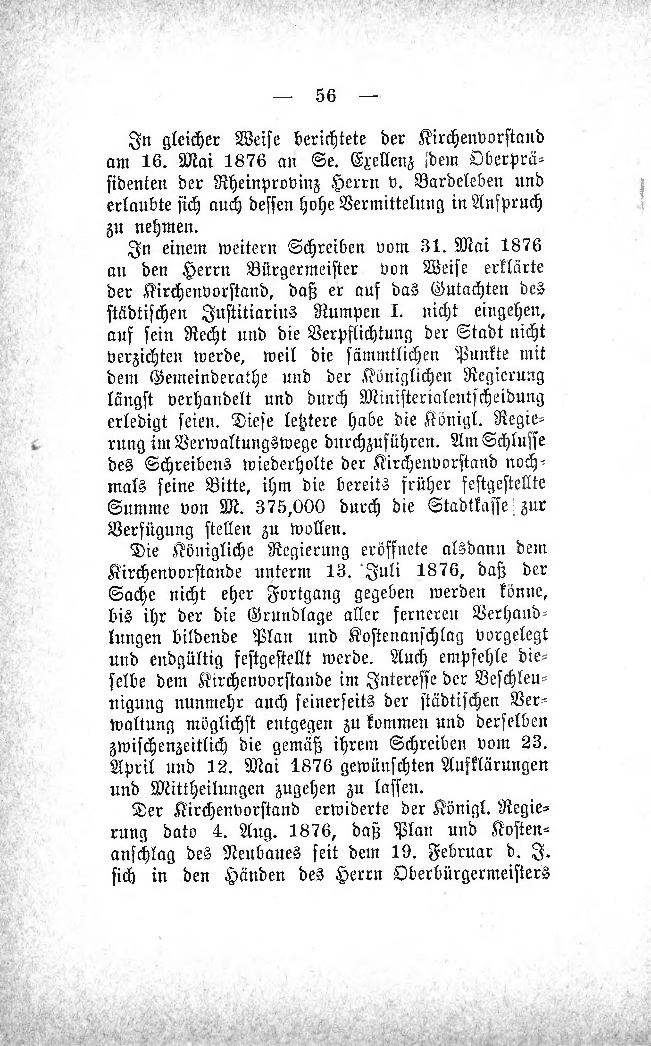 In einem weitern Schreiben vom 31. Mai 1876 an den Herrn Bürgermeister von Weise erklärte der Kirchenvorstand, daß er auf das Gutachten des städtischen Justitiarius Rumpen I. nicht eingehen, auf sein Recht und die Verpflichtung der Stadt nicht verzichten werde, weil die sämmtlichen Punkte mit dem Gemeinderathe und der Königlichen Regierung längst verhandelt und durch Ministerialentscheidung erledigt seien. Diese letztere habe die Königl. Regierung im Verwaltungswege durchzuführen. Am Schlusse des Schreibens wiederholte der Kirchenvorstand nochmals seine Bitte, ihm die bereits früher festgestellte Summe von M. 375,000 durch die Stadtkasse zur Verfügung stellen zu wollen.