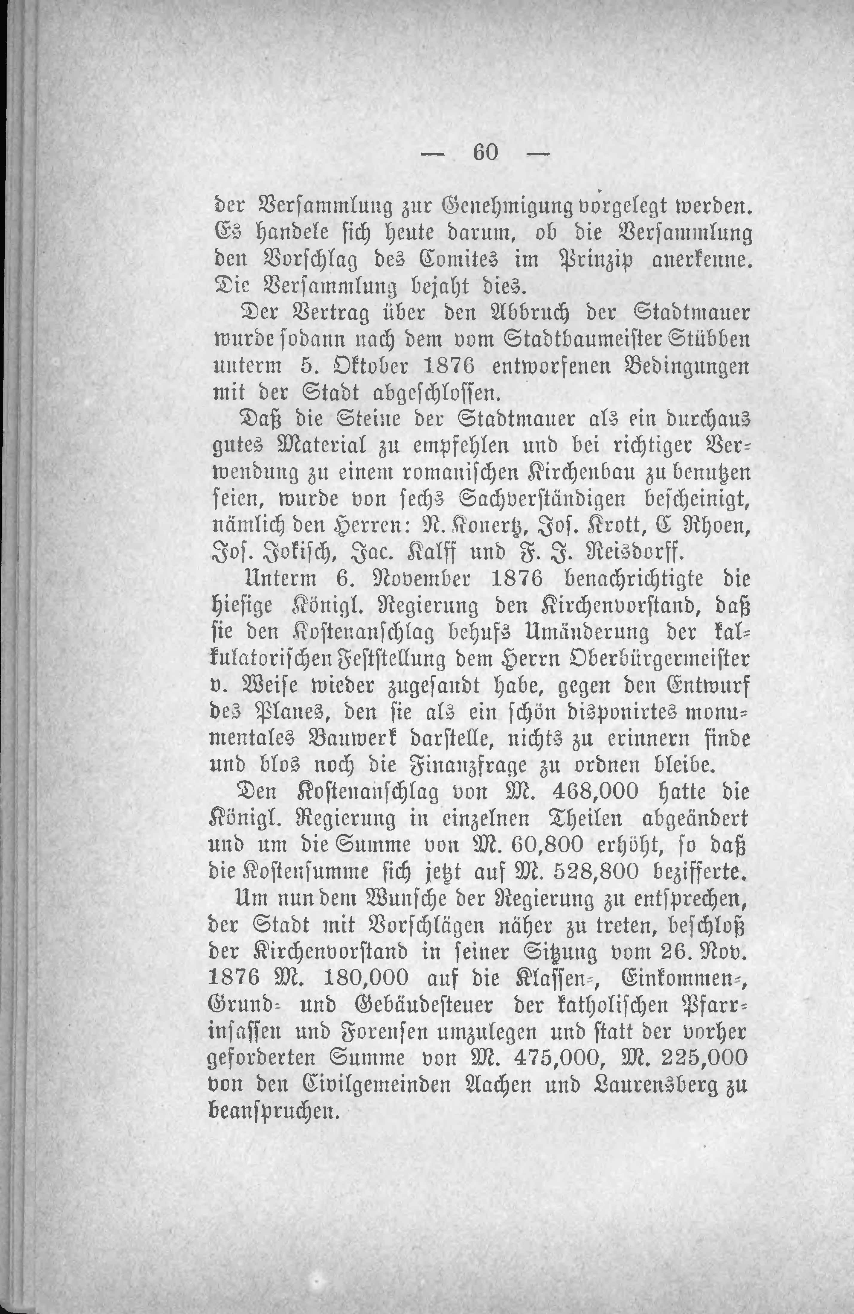 Um nun dem Wunsche der Regierung zu entsprechen, der Stadt mit Vorschlägen näher zu treten, beschloß der Kirchenvorstand in seiner Sitzung vom 26. Nov. 1876 M. 180,000 auf die Klassen-, Einkommen-, Grund- und Gebäudesteuer der katholischen Pfarrinsassen und Forensen umzulegen und statt der vorher geforderten Summe von M. 475,000, M. 225,000 von den Civilgemeinden Aachen und Laurensberg zu beanspruchen.