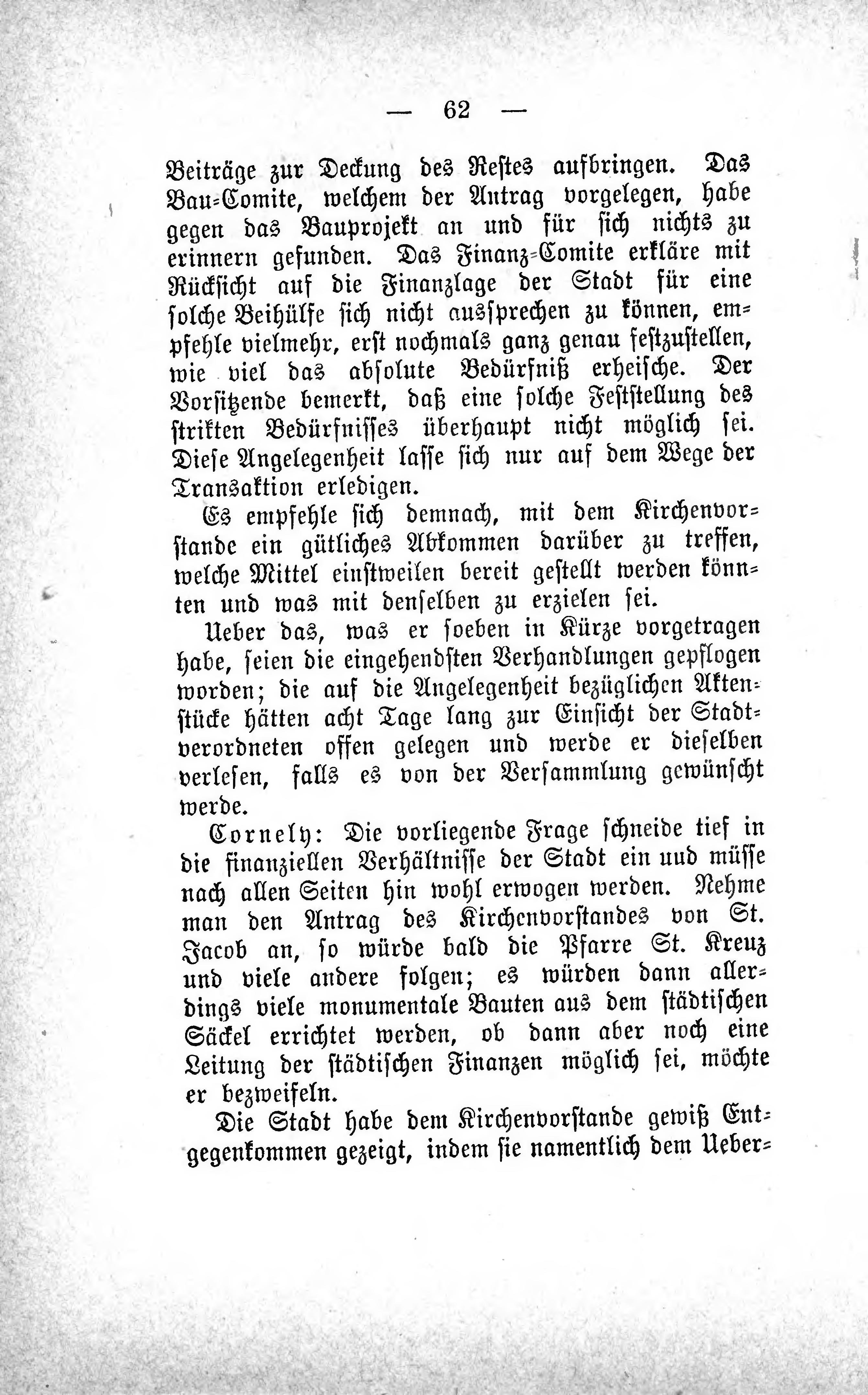 Cornely: Die vorliegende Frage schneide tief in die finanziellen Verhältnisse der Stadt ein und müsse nach allen Seiten hin wohl erwogen werden. Nehme man den Antrag des Kirchenvorstandes von St. Jacob an, so würde bald die Pfarre St. Kreuz und viele andere folgen; es würden dann allerdings viele monumentale Bauten aus dem städtischen Säckel errichtet werden, ob dann aber noch eine Leitung der städtischen Finanzen möglich sei, möchte er bezweifeln.