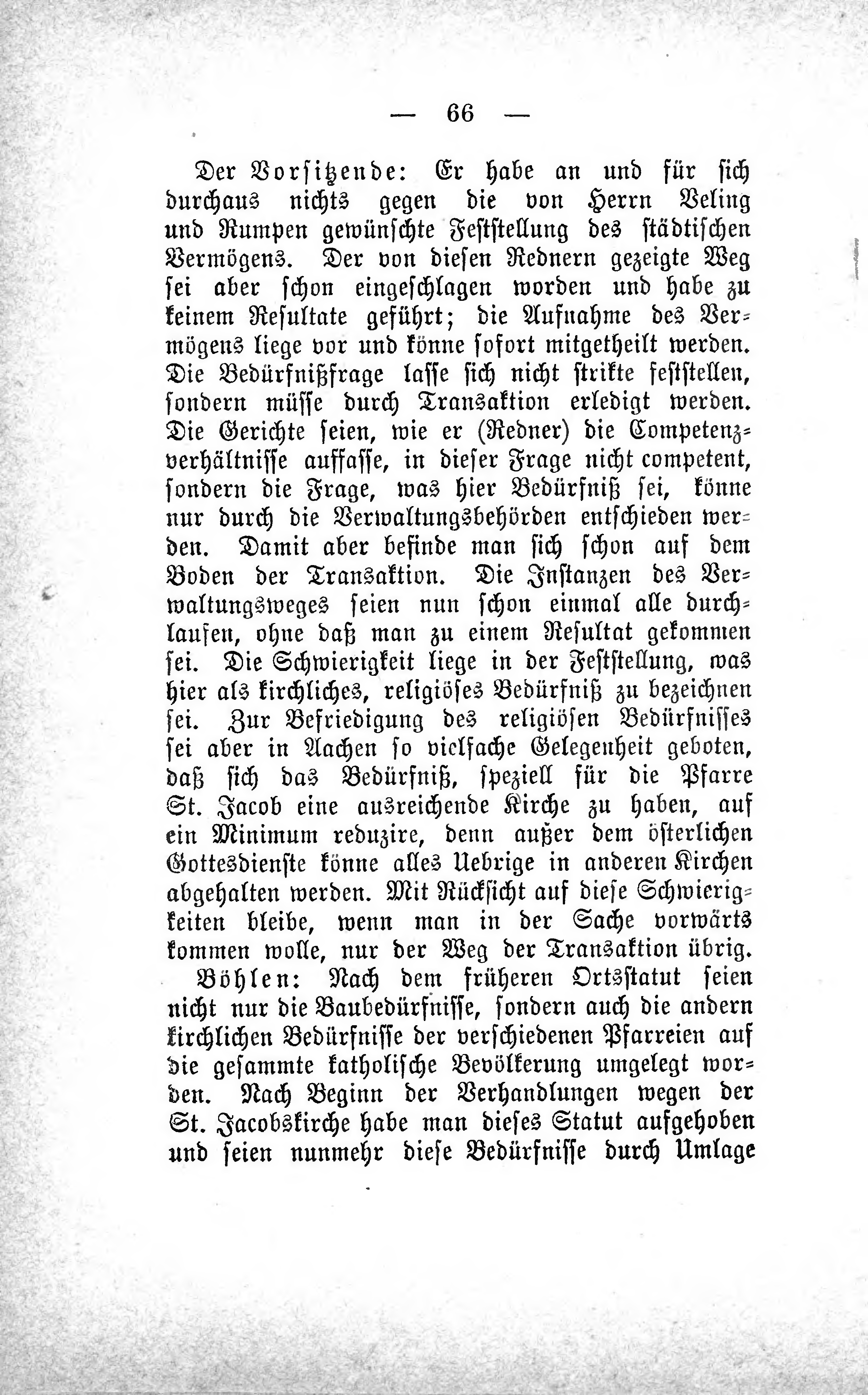 Der Vorsitzende: Er habe an und für sich durchaus nichts gegen die von Herrn Veling und Rumpen gewünschte Feststellung des städtischen Vermögens. Der von diesen Rednern gezeigte Weg sei aber schon eingeschlagen worden und habe zu keinem Resultate geführt; die Aufnahme des Vermögens liege vor und könne sofort mitgeteilt werden. Die Bedürfnißfrage lasse sich nicht strikte feststellen, sondern müsse durch Transaktion erledigt werden. Die Gerichte seien, wie er (Redner) die Competenz-Verhältnisse auffasse, in dieser Frage nicht competent, sondern die Frage, was hier Bedürfniß sei, könne nur durch die Verwaltungsbehörden entschieden werden. Damit aber befinde man sich schon auf dem Boden der Transaktion. Die Instanzen des Verwaltungsweges seien nun schon einmal alle durchlaufen, ohne daß man zu einem Resultat gekommen sei. Die Schwierigkeit liege in der Feststellung, was hier als kirchliches, religiöses Bedürfniß zu bezeichnen sei. Zur Befriedigung des religiösen Bedürfnisses sei aber in Aachen so vielfache Gelegenheit geboten, daß sich das Bedürfniß, speziell für die Pfarre St. Jacob eine ausreichende Kirche zu haben, auf ein Minimum reduzire, denn außer dem österlichen Gottesdienste könne alles Uebrige in anderen Kirchen abgehalten werden. Mit Rücksicht auf diese Schwierigkeiten bleibe, wenn man in der Sache vorwärts kommen wolle, nur der Weg der Transaktion übrig.