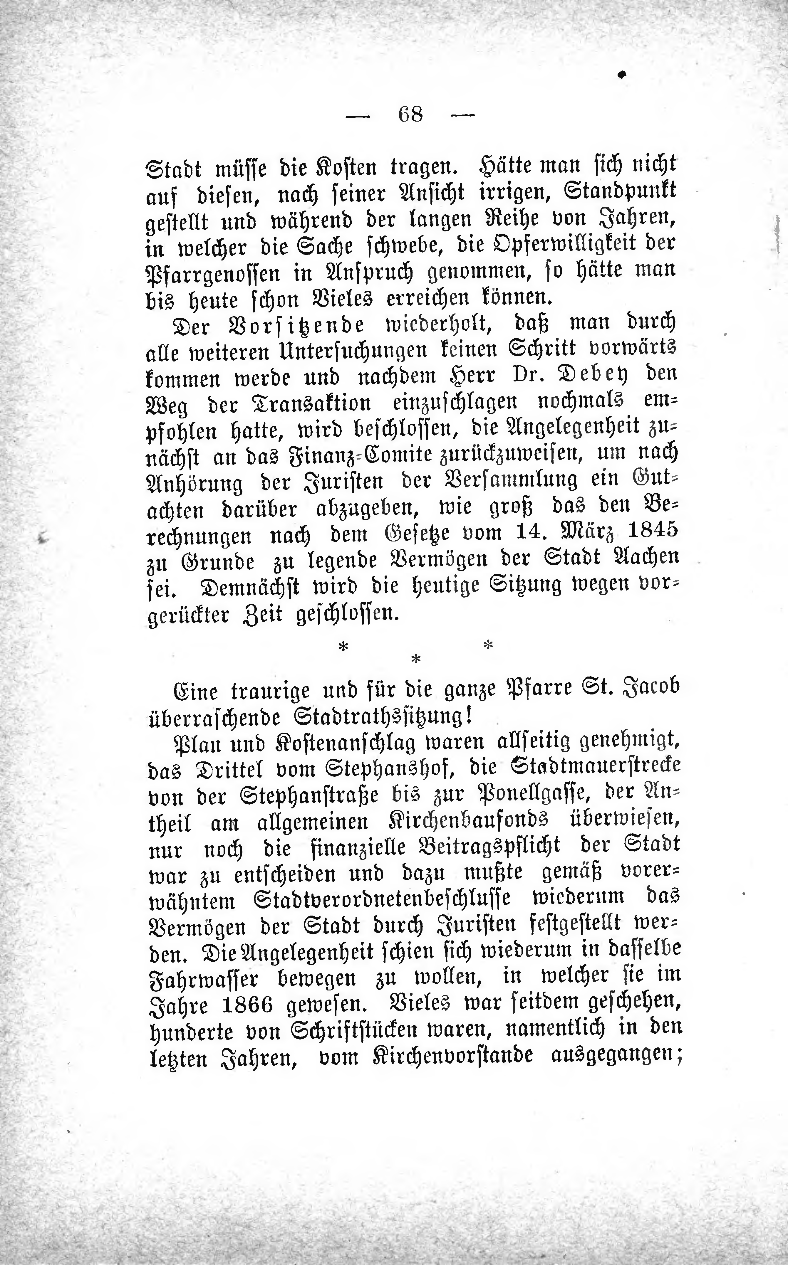 Stadt müsse die Kosten tragen. Hätte man sich nicht auf diesen, nach seiner Ansicht irrigen, Standpunkt gestellt und während der langen Reihe von Jahren, in welcher die Sache schwebe, die Opferwilligkeit der Pfarrgenossen in Anspruch genommen, so hatte man bis heute schon Vieles erreichen können.