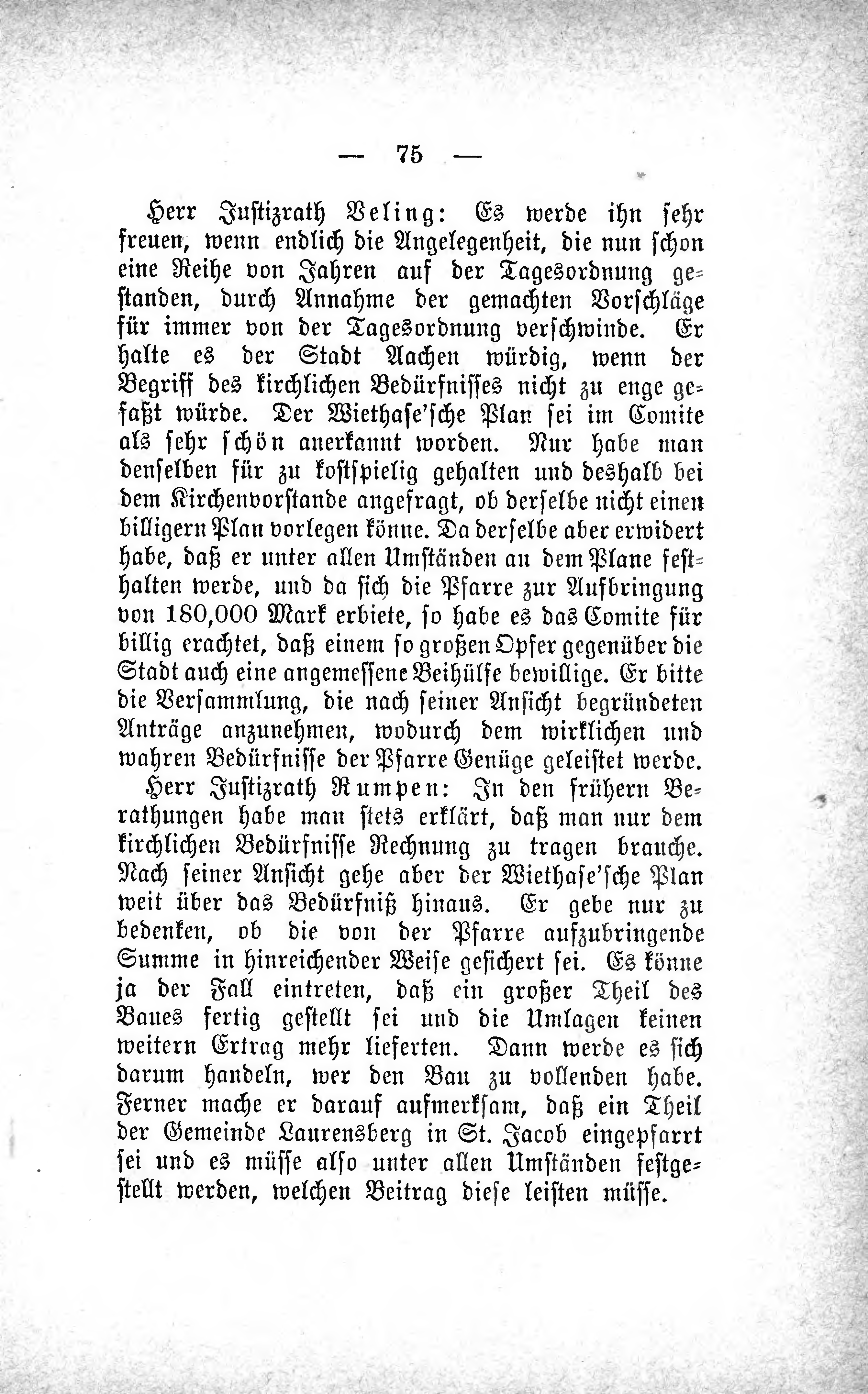 Herr Justizrath Veling: Es werde ihn sehr freuen, wenn endlich die Angelegenheit, die nun schon eine Reihe von Jahren auf der Tagesordnung gestanden, durch Annahme der gemachten Vorschläge für immer von der Tagesordnung verschwinde. Er halte es der Stadt Aachen würdig, wenn der Begriff des kirchlichen Bedürfnisses nicht zu enge gefaßt würde. Der Wiethase'sche Plan sei im Comite als sehr schön anerkannt worden. Nur habe man denselben für zu kostspielig gehalten und deshalb bei dem Kirchenvorstande angefragt, ob derselbe nicht einen billigern Plan vorlegen könne. Da derselbe aber erwidert habe, daß er unter allen Umständen an dem Plane festhalten werde, und da sich die Pfarre zur Aufbringung von 180,000 Mark erbiete, so habe es das Comite für billig erachtet, daß einem so großen Opfer gegenüber die Stadt auch eine angemessene Beihülfe bewillige. Er bitte die Versammlung, die nach seiner Ansicht begründeten Anträge anzunehmen, wodurch dem wirklichen und wahren Bedürfnisse der Pfarre Genüge geleistet werde.