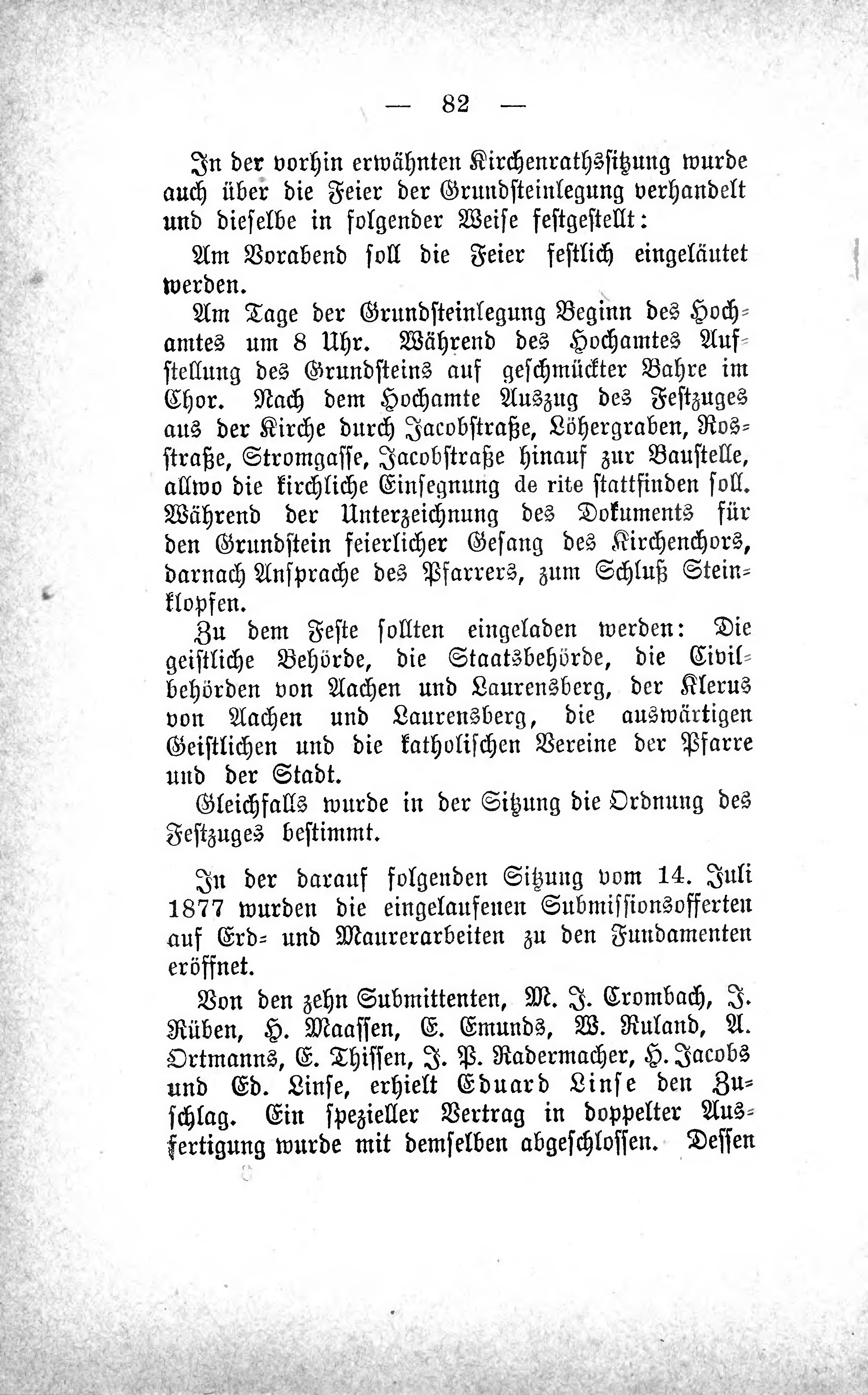 Von den zehn Submittenten, M. J. Crombach, J. Rüben, H. Maassen, E. Emunds, W. Ruland, A. Ortmanns, E. Thissen, J. P. Radermacher, H. Jacobs und Ed. Linse, erhielt Eduard Linse den Zuschlag. Ein spezieller Vertrag in doppelter Ausfertigung wurde mit demselben abgeschlossen. Dessen